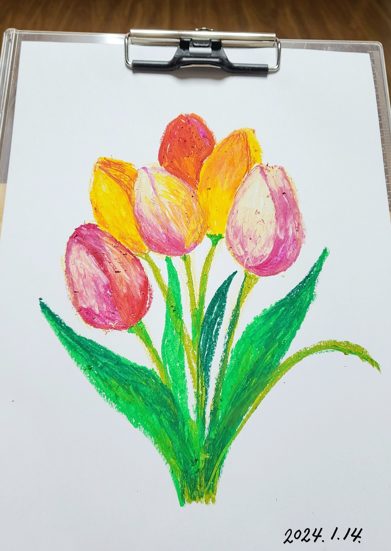 인터넷에서 6~7천 원이면 살 수 있는 24색 오일파스텔과 A4용지 한 장을 꺼내놓고, 유튜브로 '오일파스텔'을 검색했더니 다양한 영상이 나온다. 그중에서도 꽃을 좋아하는 나의 시선에 들어온 건 튤립 꽃다발 그리기 영상이었다. 영상에 나오는 사람은 나보다 훨씬 더 많은 색깔의 오일파스텔을 가지고 있어서 똑같은 색감을 구사할 수는 없지만, 그래도 내가 가진 색깔들 중에서 어울리는 것들로 조합하여그려보기로 했다.