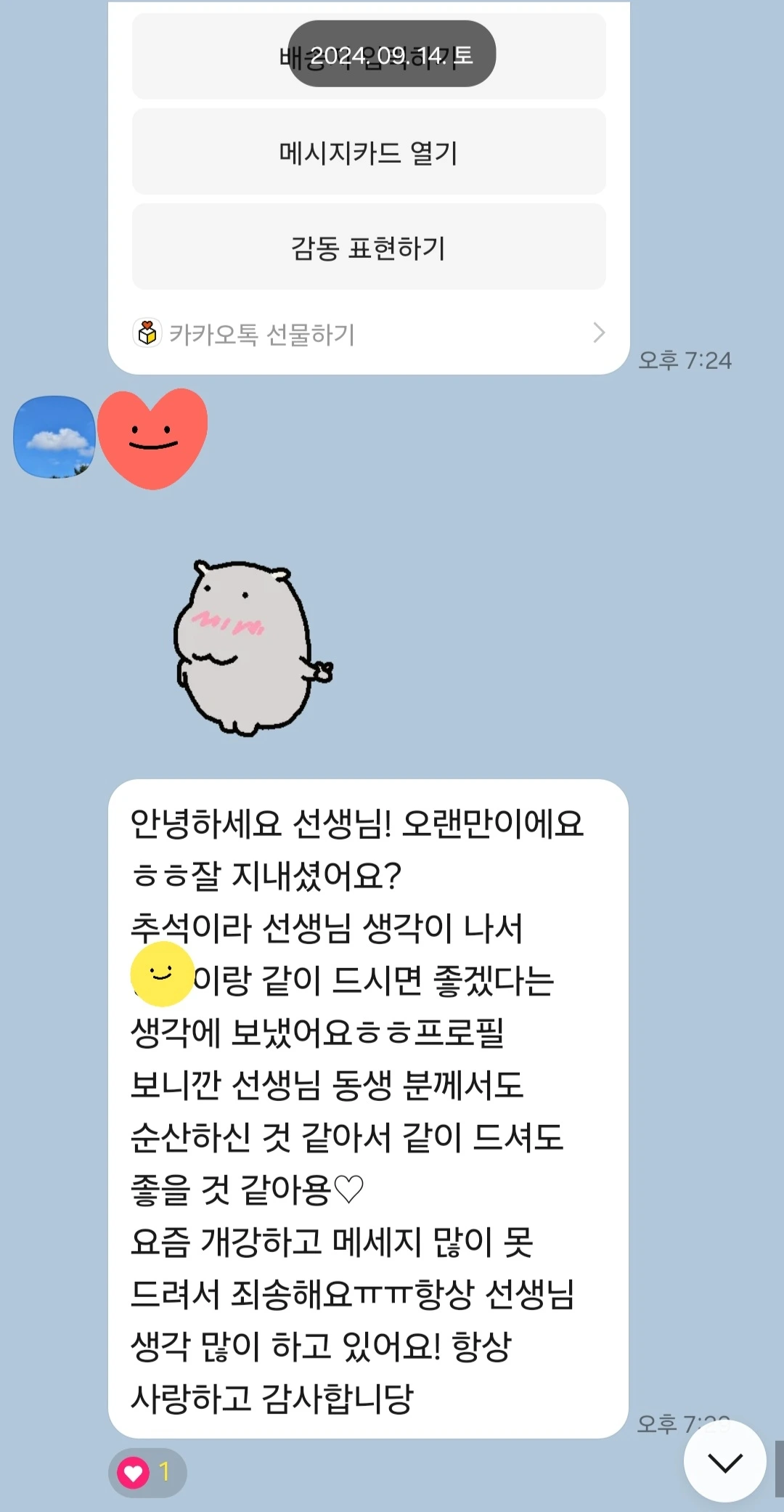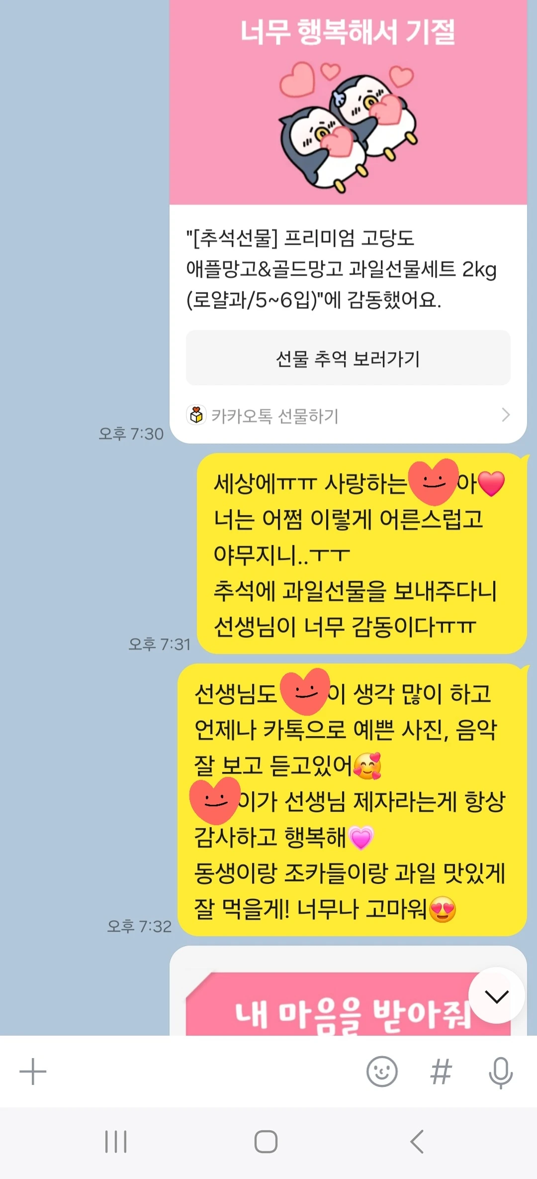 그렇게 가족들과 좋은 시간을 보내고 있던 저녁 무렵, 나를 더욱 행복하게 해 준 반가운 카톡 진동이 울렸다.
