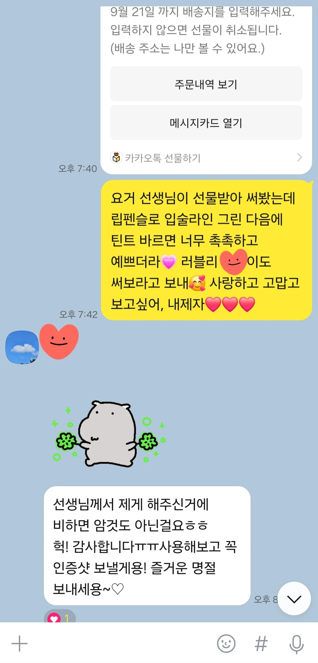 사랑스러운 나의 제자는 사려 깊게 따뜻한 답장을 보내며 사용해 보고 인증샷을 보내주겠다고 했다. 이다지도 세심하고 배려심 깊은 소녀가 나의 제자라는 사실이 너무나 자랑스럽고 감사하다.