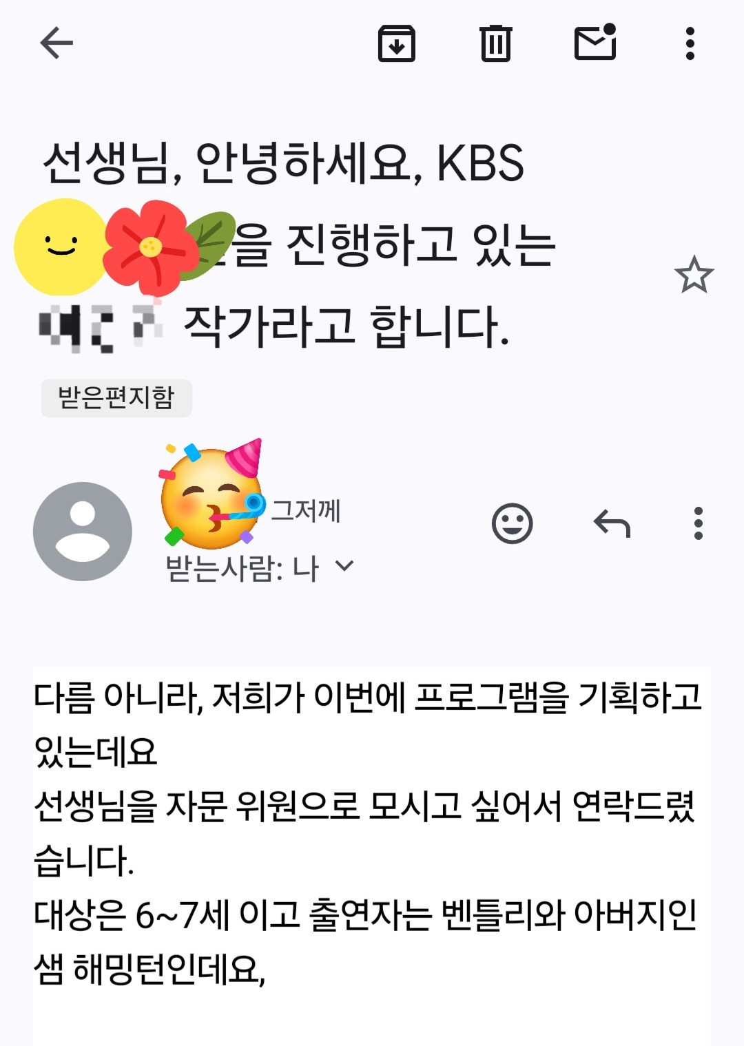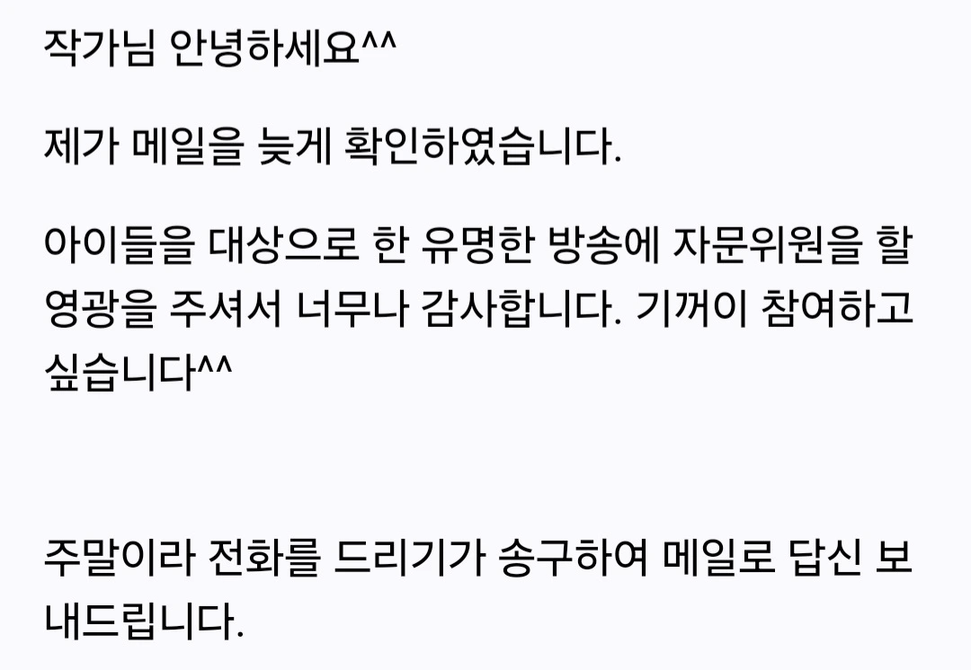 어제는 오랜만에 메일함을 열어봤더니 너무나 반가운 연락이 와 있었다. KBS 방송국 작가님께서 어린이를 대상으로 한 영어 프로그램을 기획중인데, 그 프로그램의 자문위원으로 나를 위촉하고 싶다는 내용이었다.