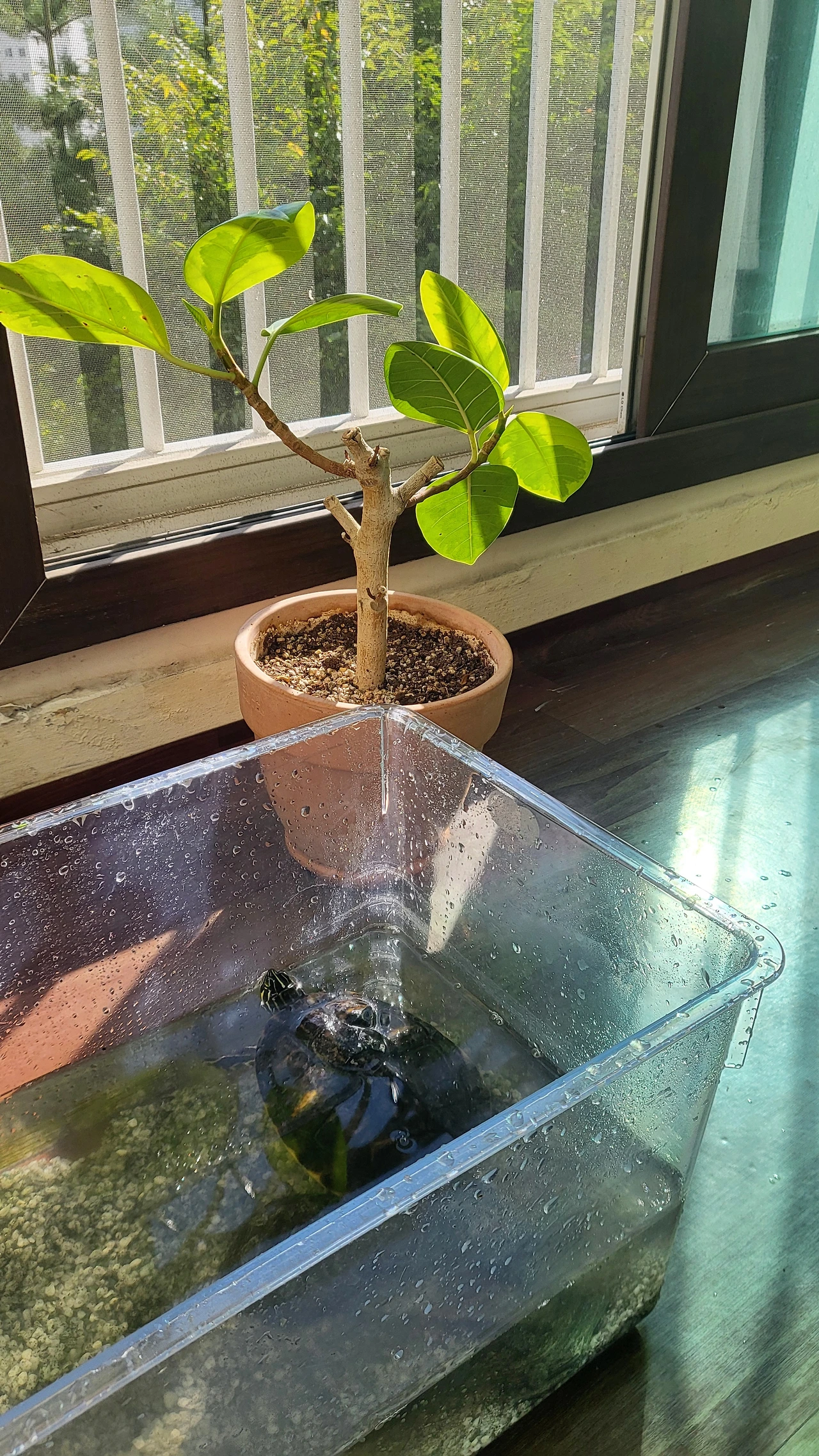 식물들을 챙긴 후에, 우리 집에서 6년째 함께하고 있는 반려동물 거북이의 수조도 깨끗하게 청소하고 물을 갈아주었다. 햇빛이 너무 좋아서 베란다 일광욕도 시켜주었다.