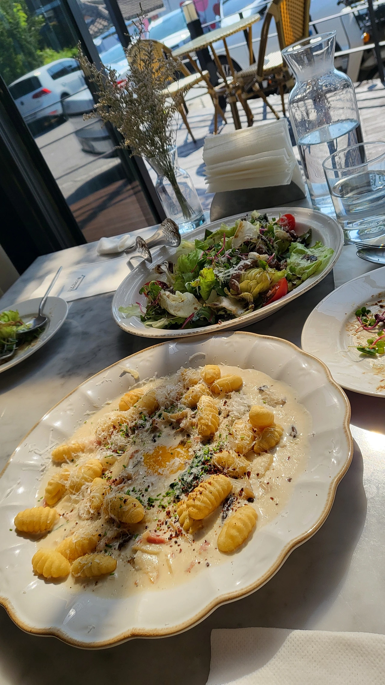 메뉴를 보니 요즘 인기 있는 '뇨끼'가 있길래 찹스테이크 샐러드와 함께 주문했다. 노란 빛깔의 부드러운 크림소스와 감자의 쫀득한 식감이 어우러져 너무 맛있었다.