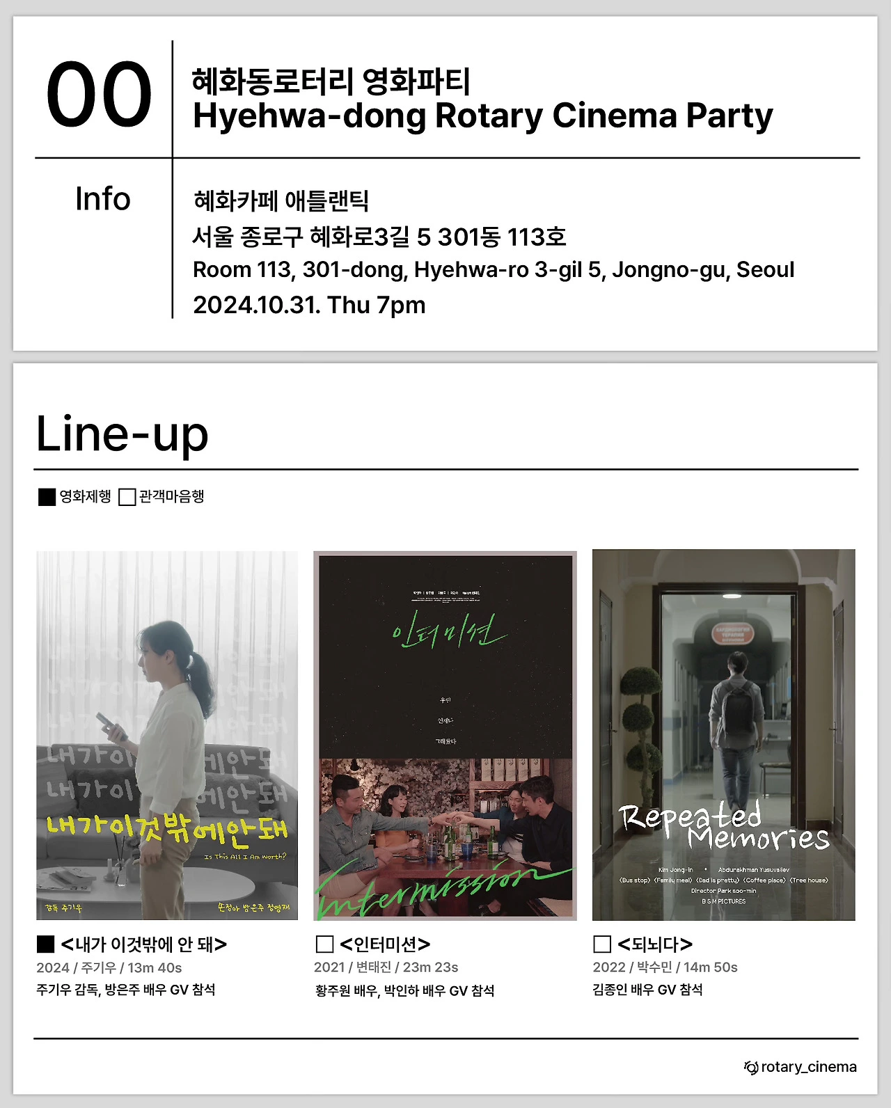제0회 혜화동로터리 영화파티가 10월 31일 목요일 오후 7시에 혜화카페 애틀랜틱에서 진행됩니다.