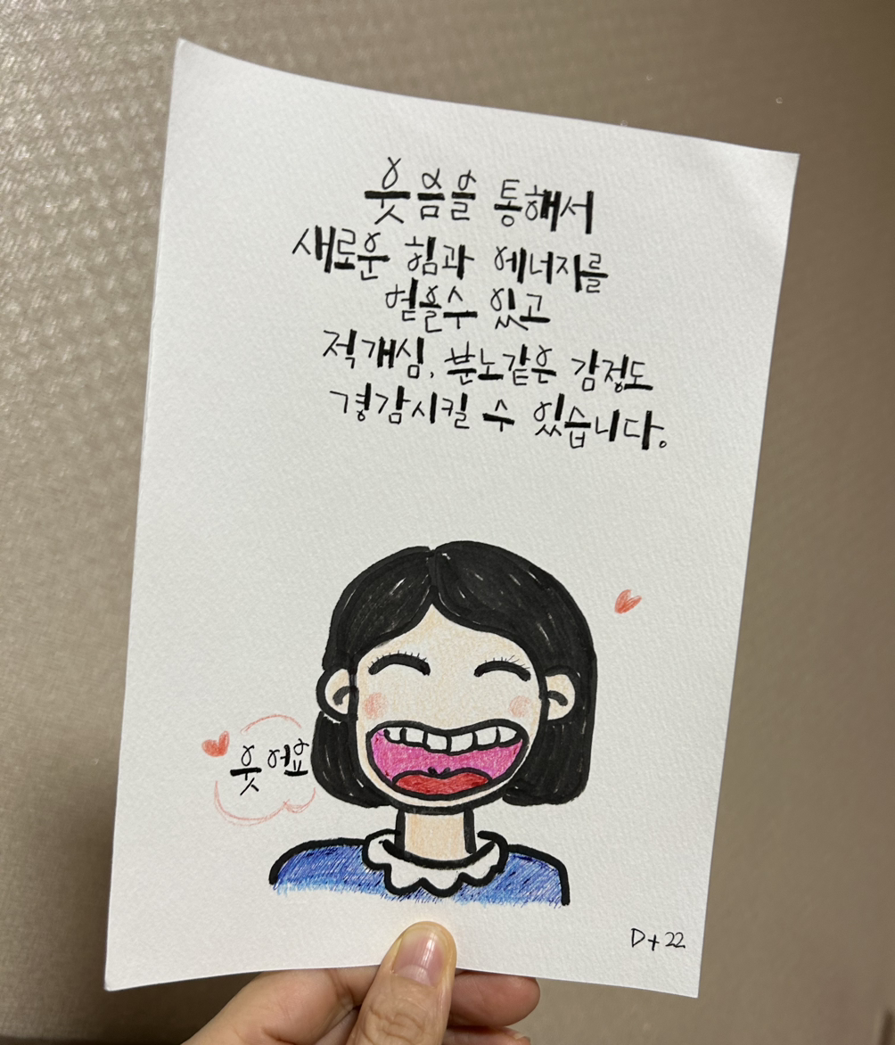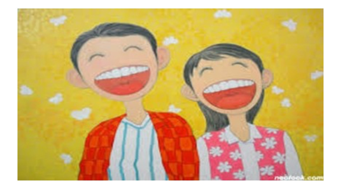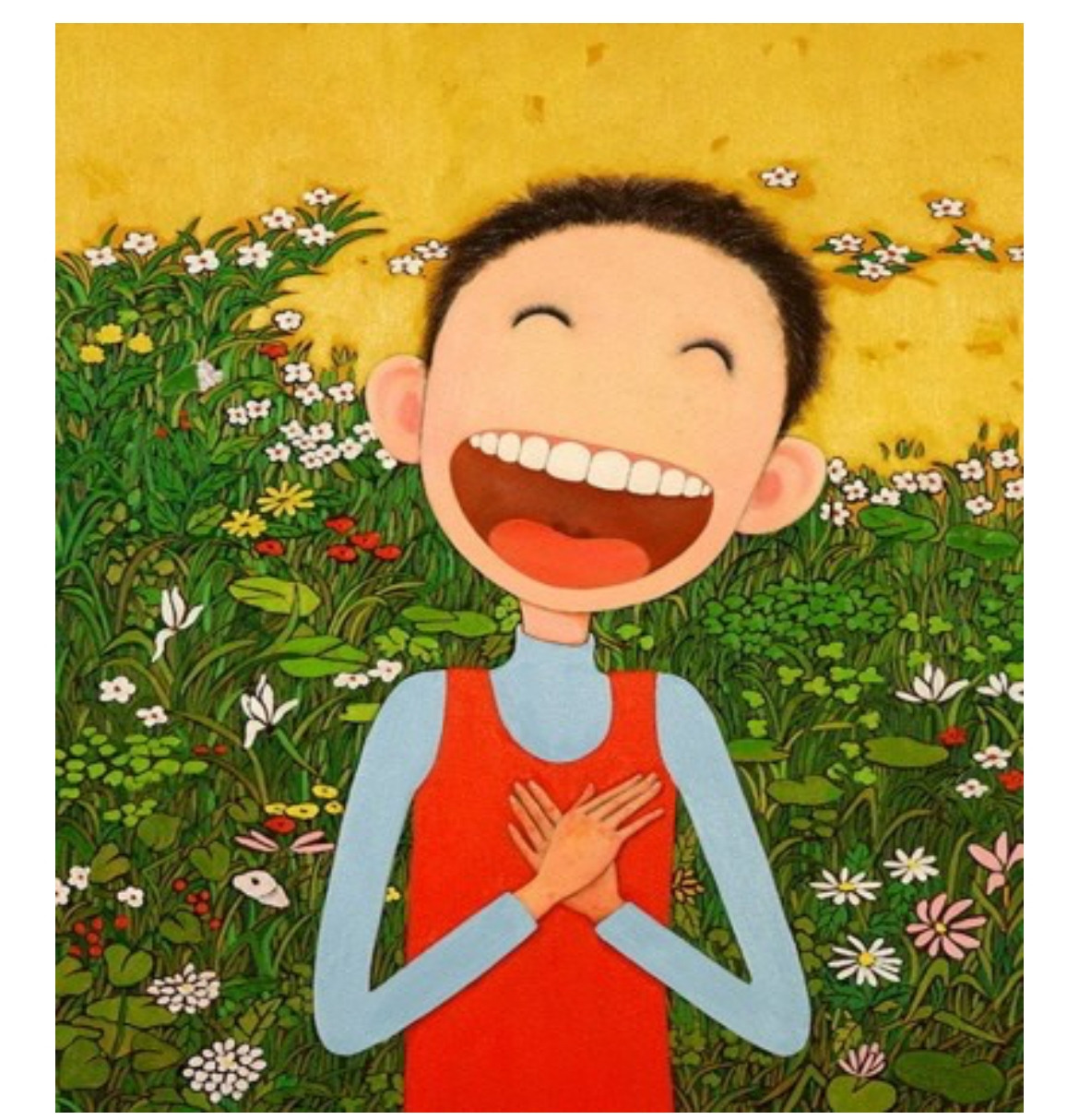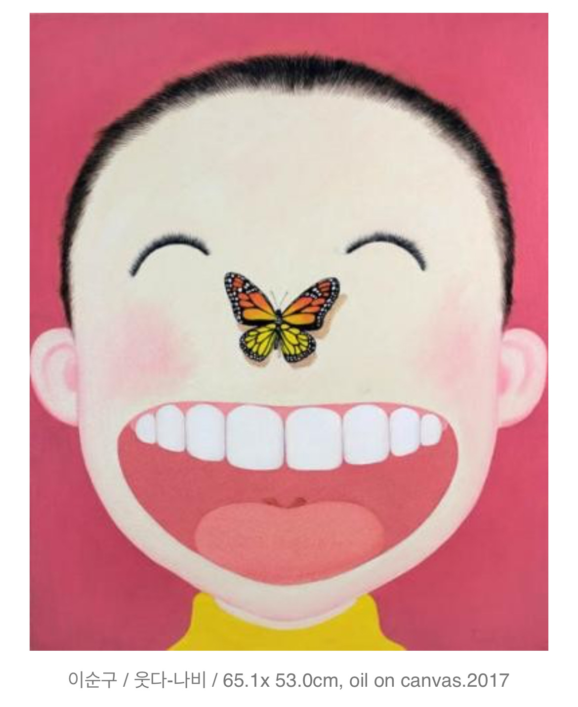 뒤센미소를 그대로 보여주는 그림이 있다. 바로 이순구 작가의 작품이다. 분홍빛 잇몸과 고른 앞니, 앙증맞은 목젖까지 시원하게 드러나는 함박웃음, 그리고 눈이 한결같이 웃고 있는 그림이다. 찐 웃음이다.