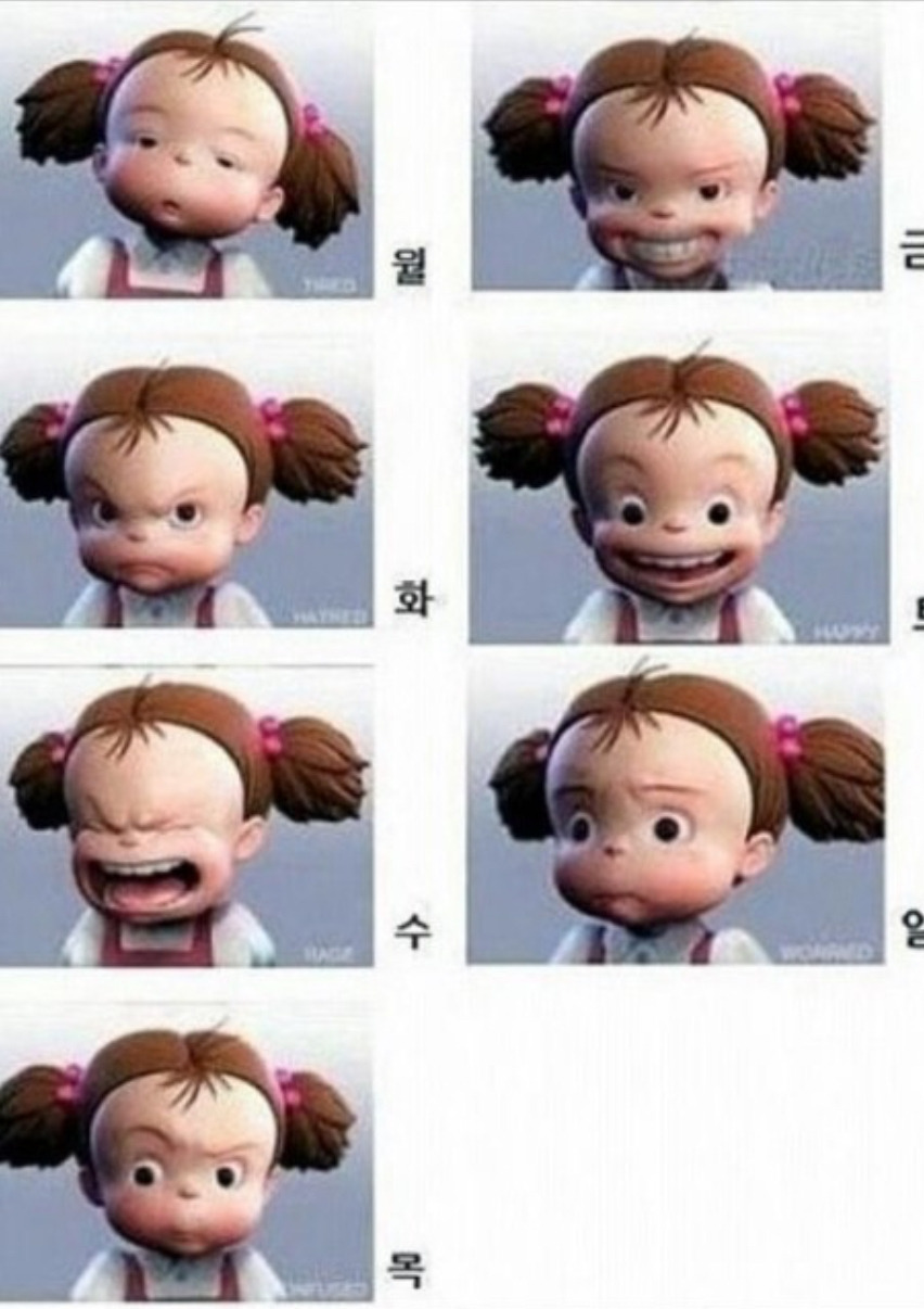 직장인의 일주일 표정이라며 인터넷에서 뜨거운 반응을 얻었던 이미지다.