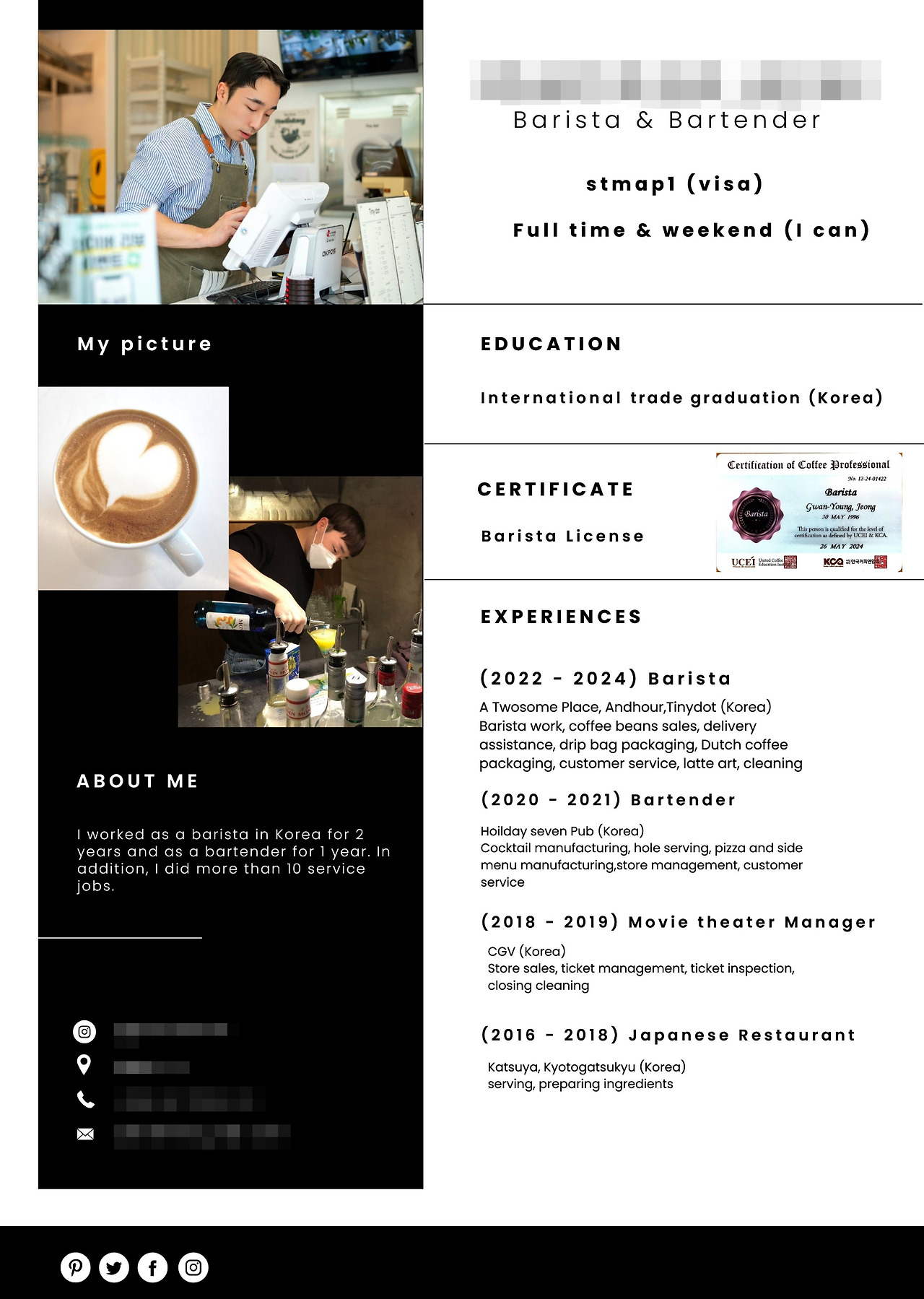 이 이력서 덕분에 여러 카페에서 동시에 합격할 수 있었다고 생각한다.
