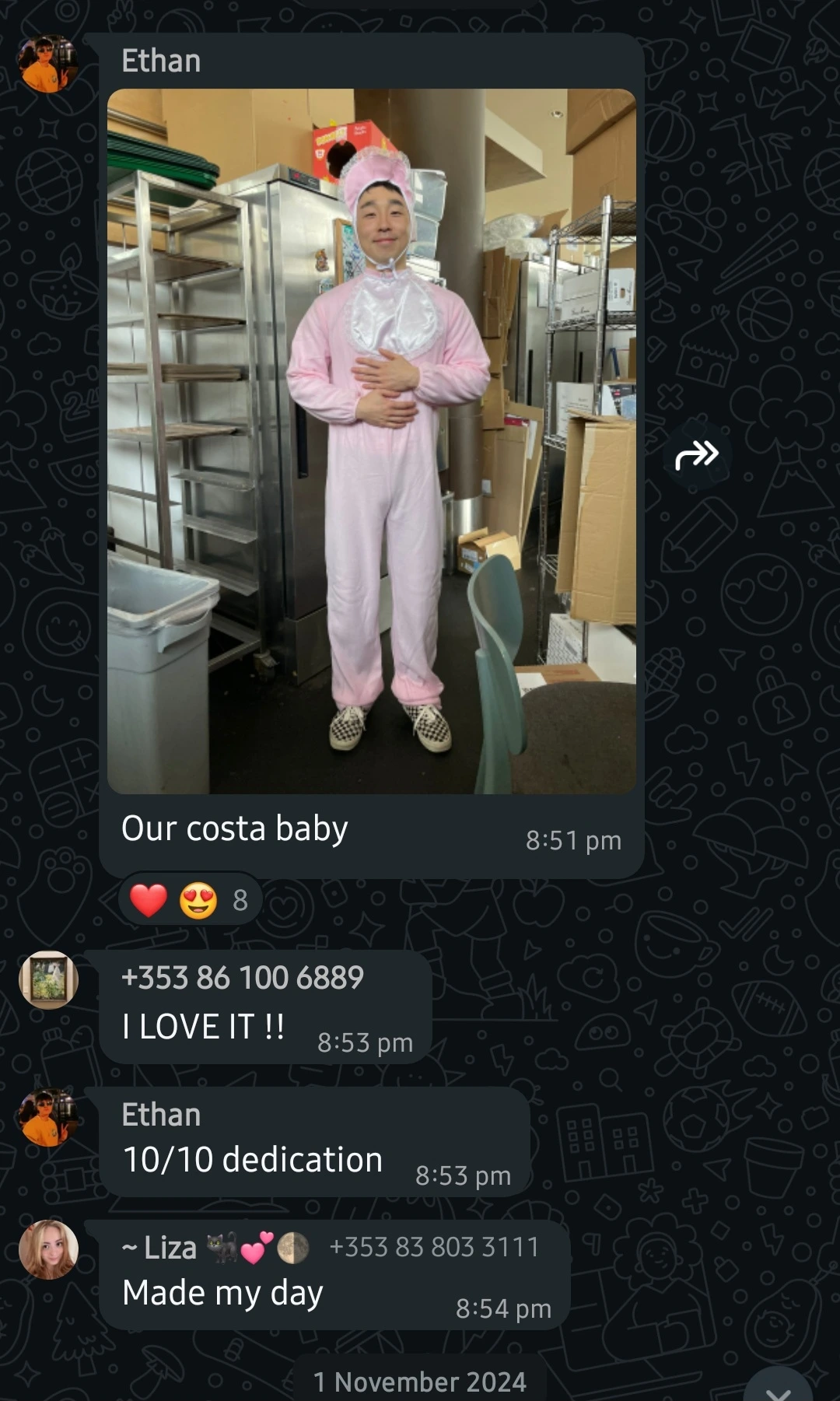 우리는 당일날 어떻게 하면 좋을지 상의하기 시작했다. 같은 날 출근하는 팀 리더가 '할로윈데이 때 우리는 무조건 코스튬을 입어야 한다'며 신신당부를 했다. 우리가 코스튬을 입지 않아도 자기는 꼭 입을 거라면서 말이다. 그러면서 작년 사진을 보여줬는데 꽤나 열정적으로 준비한 모습이었다.