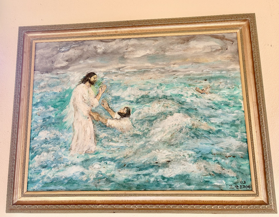 서귀포 성당에서 내 눈을 붙든 것은 물에 빠진 베드로와 그를 바라보는 예수님을 그린 그림이었다. 알려진 명화 같지는 않았으나 넘실대는 파도의 물빛깔이 마음에 들었다. 그리고 무엇보다 예수님을 붙잡으려는 베드로의 간절함이 전해졌다.