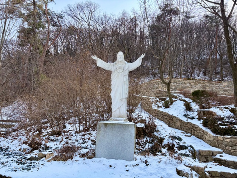 주차장 주변은 이틀 전 내린 눈으로 덮여 있었다. 돌계단과 두 팔을 벌리신 예수님상이 보였다. 작은 기념관으로 가자 하얀 벽면에 1860년대 한국을 찾으신 프랑스 두 신부님의 조선입국경로가 그려져 있었다. 말이 안 되는 멀고 먼 거리였다. 아프리카 희망봉을 둥글게 에워싸는 화살표만 봐도 입이 안 다물어졌다. 어떻게 저런 행로가 가능했을까. 비행기도 없던 160여 년 전에.