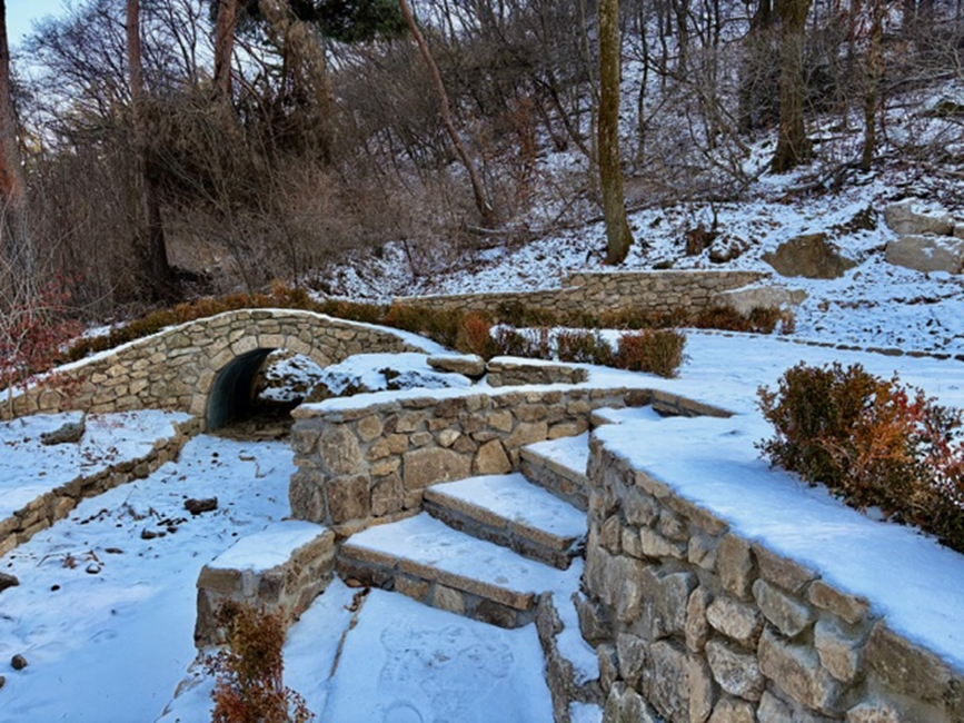 현양비 꼭대기에는 작은 돌 십자가가 있었는데 도리 신부 부모님이 사용하던 맷돌로 만든 것이라고 했다. 내 시선은 현양비를 넘어 작은 돌계단으로 향했다. 만화 ‘플란다스의 개’에 나올 법한 작은 돌다리도 있었다. 신부님들의 고향인 프랑스 시골을 본뜬 걸까 싶었다. 돌계단과 돌다리에 살포시 눈이 쌓인 풍경은 빈티지 크리스마스 카드처럼 앙증맞고 예뻤다. 눈 밟는 소리를 들으며 몇 개의 계단을 올랐다.