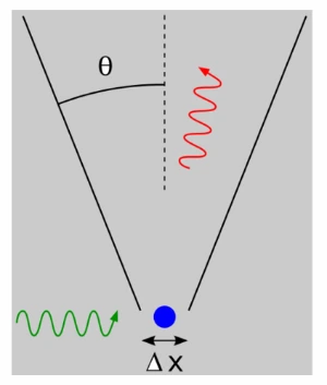 Fig. 1. Heisenberg’s Microscope: To measure the position of a quantum mechanical particle, e.g. electron, we use the scattered light from the electron. When the position is measured, the momentum of the electron can be disturbed depend upon the wavelength of the incident light beam.