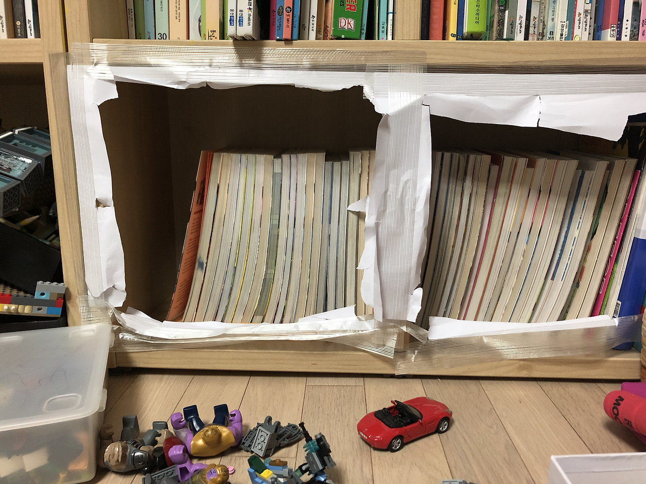 읽는 시간을 정해도 보고 (이건 일주일 정도는 했던 것 같다. 시간을 못 지키면 책장을 막아버리기로 약속했었다. 사진처럼 며칠 못가 초토화되었다.)