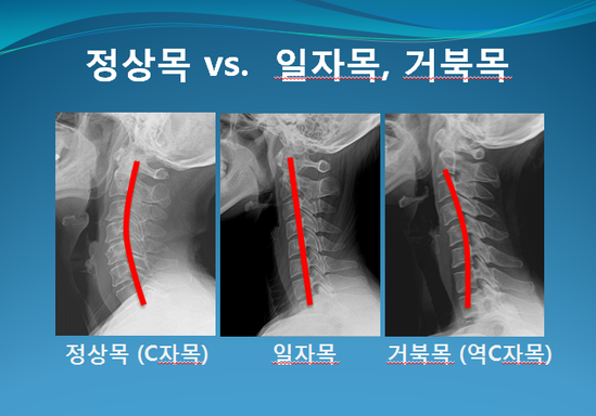 아래의 참고사진처럼, 정상적인 C자목에서 일자목의 상태를 거쳐 거북목이 되는데, 초기에는 그저 목이 좀 뻣뻣한 정도이기 때문에 방치해두기 십상이다. 그러다 어느 날 뒷목과 어깨 결림이 심해 목을 움직일 때마다 아프고 자유로운 동작도 힘들어 병원을 찾으면 "거북목이시군요."라는 진단과 함께 치료를 권유받는다.