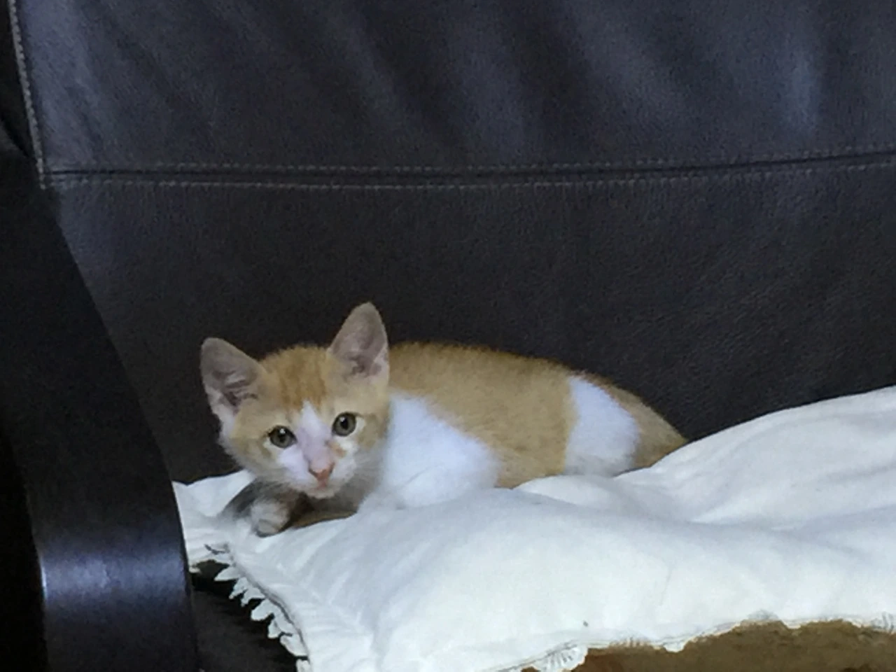 어미에게 버림받고 차고에서 발견된 치즈 태비 수컷이었는데, 가엽게도 온 몸이 종합병원이었다. 귓속에 진드기가 가득하고, 심한 눈병에, 감기에, 링웜(전염성 높은 피부질환)까지...