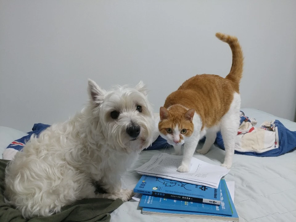 "아~지긋지긋해!"라는 외침과 함께 잠시 머리 식히러 나갔다 왔더니... 멍냥이 동생들이 수험서를 점령했네요.