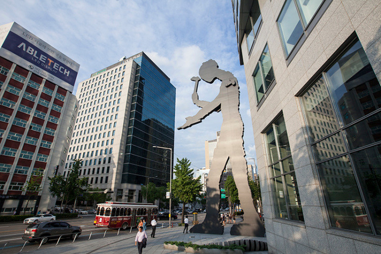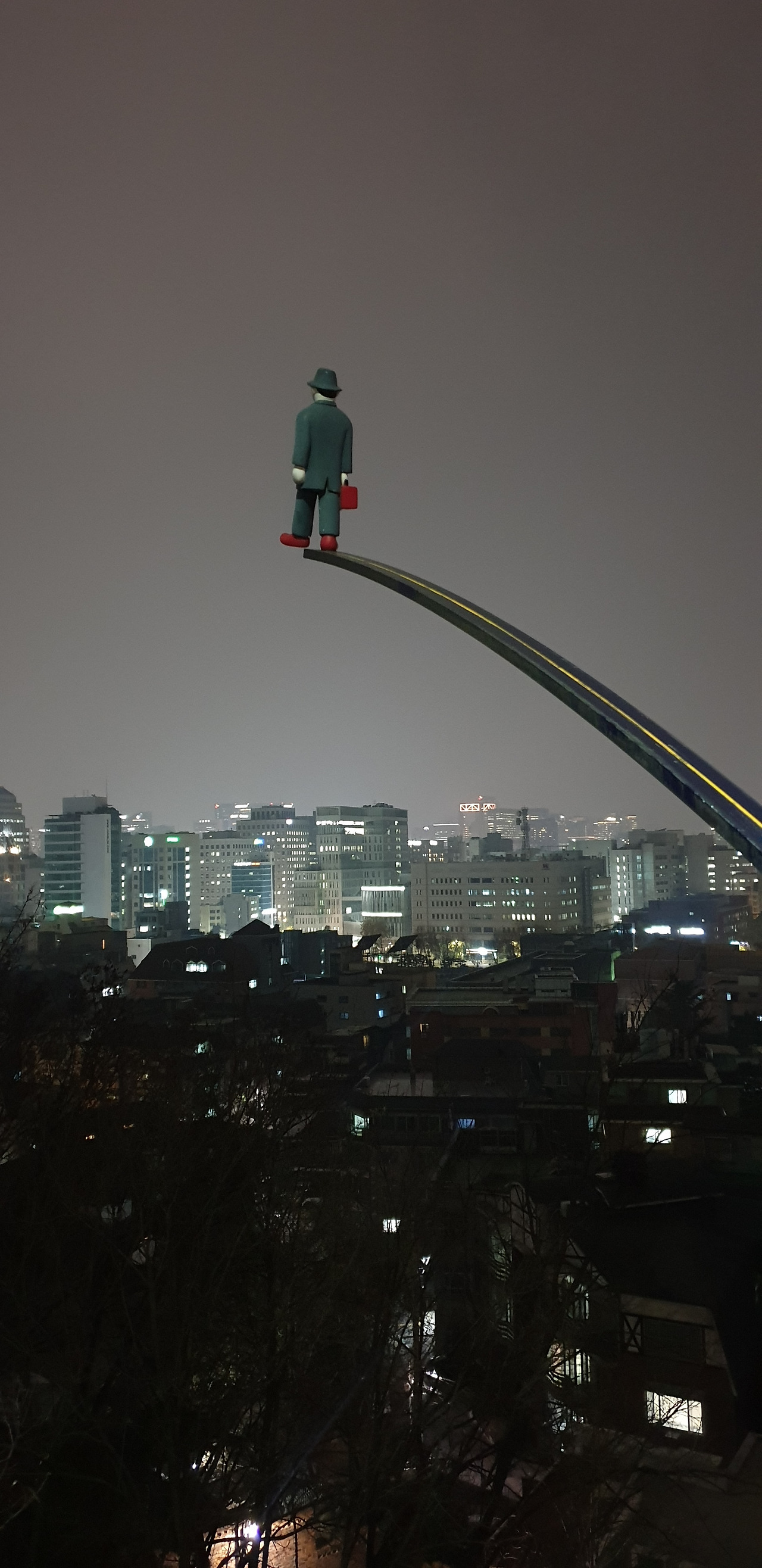 조나단 보로프스키(Jonathan Borofsky, 1942~)는 미국 출생의 조각가로 세계 도시의 공공장소나 빌딩 앞에 초현실적인 대형 작품을 설치하는 작가입니다. 그는 1979년 뉴욕의 폴라 쿠퍼 갤러리(Paola Cooper Gallery, New York)에서 <워커 Worker>라는 제목으로 해머링 맨(Hammering Man) 형태의 작품을 처음 선보였습니다. 그리고 이후 곧바로 <해머링 맨>으로 이름을 바꾸고 조각가로서의 명성을 얻으며 세계 11 개의 도시에 <해머링 맨>을 설치했습니다. 독일, 스위스, 미국 등에 이어 7번째로 설치된 흥국생명빌딩의 해머링 맨은 22m의 크기로 세계에서 가장 큰 규모를 자랑합니다.
