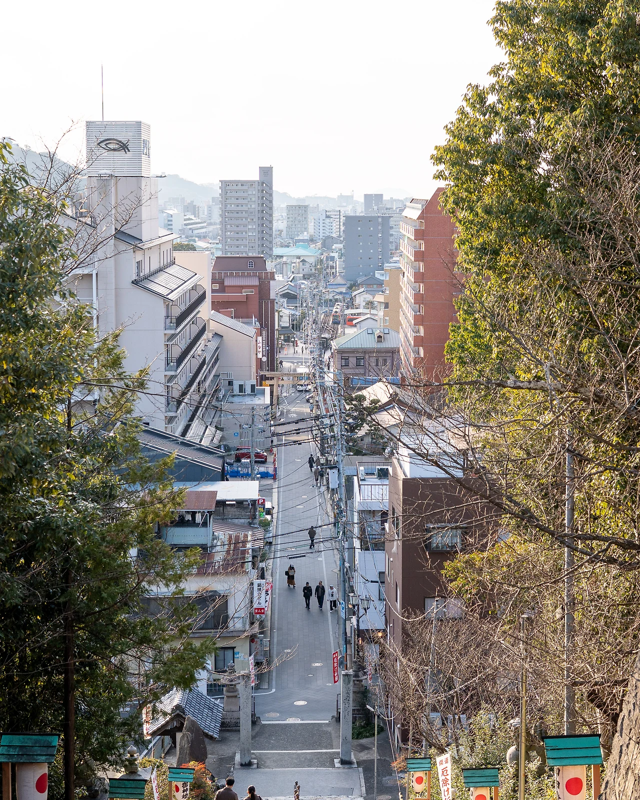 끝까지 오르니 그간의 고생을 보상받는 듯, 마쓰야마의 전경이 펼쳐 보이는 뷰가 파노라마처럼 펼쳐졌다. 잠깐 전경을 보며 둘러보며 한숨 돌릴 새도 없이 정상에 떡 하니 선-어떤 표현이 맞을지 모르겠지만 지금 이 상황을 표현하기에는 수식어 없이 담백한 바로 이 표현이 좋을 것 같다- 신사가 눈앞에 가득 찼다. 저녁노을에 비친 눈 부신 주색의 ‘ㅁ’ 자 건물이 눈 부셨다. 일본에서 신사는 수도 없이 봐 왔지만 마쓰야마 시내가 펼쳐지는 이곳에서 저녁노을이 비추는 이 풍경은 찰나의 순간을 빛나게 했다.