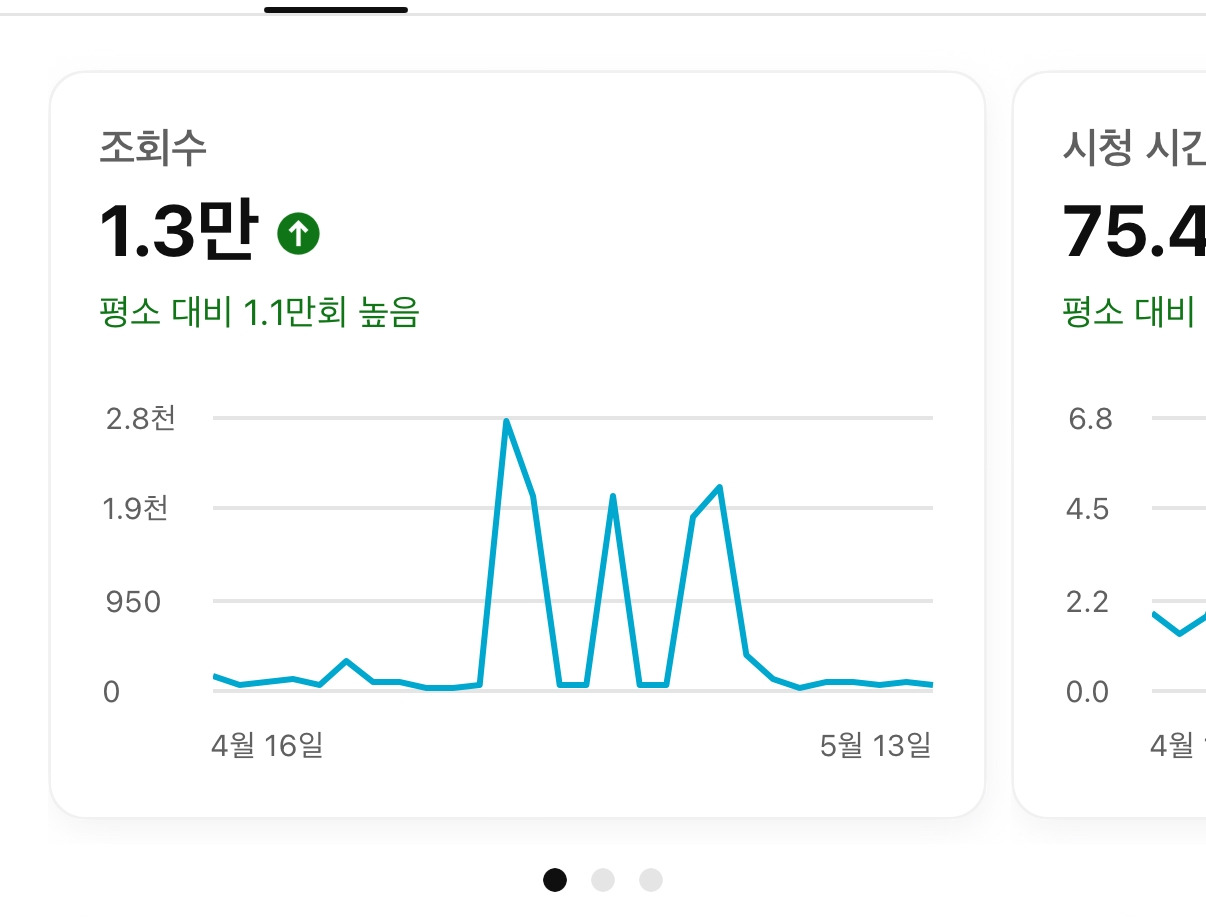영상을 올리다 보면 조금씩 조회수가 오르다가 뚝 끊기는 시점이 있다. 이 시점이 영상 업로드 후 유튜브가 내 영상을 밀어 주는 (노출) 기간이겠구나 하는 생각이 든다. 그동안 나는 영상을 일주일에 하나씩 올렸는데 한 이틀 정도 조회수가 오르다 뚝 끊겼다. 그래서 노출 되는 시간을 어림잡아 알게 되었다. 그래서 정리한 나만의 영상 노출 시간은 일반 영상은 36시간 정도, 쇼츠 는 12시간 정도 조회수가 오르다 끊겼다. 그렇다면 노출 빈도를 높힐 수 있는 방법은 자주 영상을 올리는 것이다. 앞서 말한 심으뜸의 말이 생각난다. 일주일 세번 영상을 올렸다고. 그렇다면 일주일 내내 유튜브에서 영상을 노출시켰다는 의미가 되니 관심 분야에 있는 사람들은 유뷰브를 켜면 힙으뜸을 항상 볼 수 밖에 없지 않을까. 그래서 나는 생각했다. 영상을 2주 2개, 쇼츠를 주 3개 업로드 해야겠다고.
