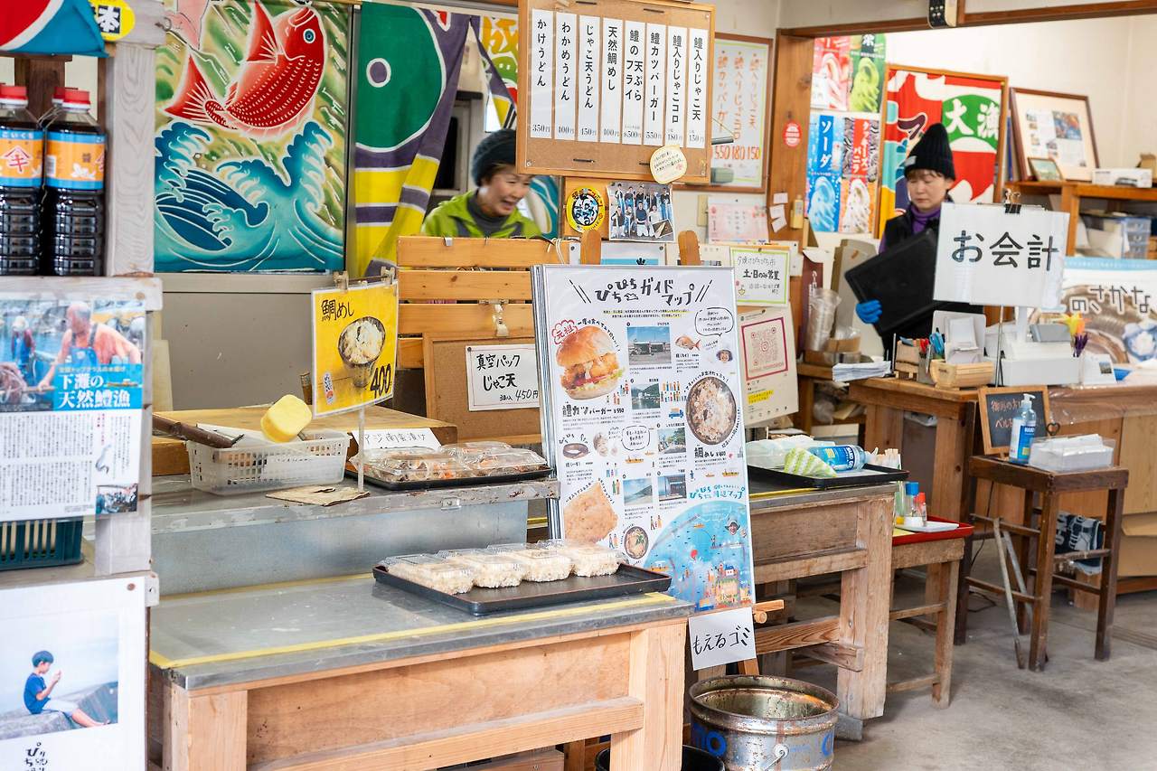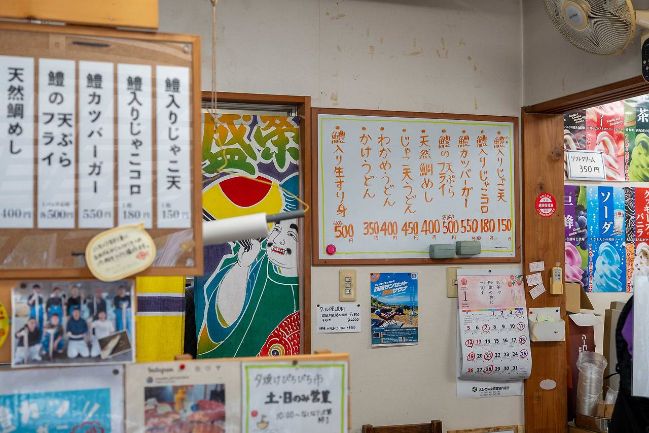 메뉴를 보니 우동이나 가벼운 식사류나 음료, 아이스크림을 팔고 있었다. 쟈코텐(じゃこ天)이 무엇인지 물어 보니, 이 지역의 명물로 생선 전체를 갈아서 밀가루와 함께 튀긴, 우리의 '오뎅' 같은 음식이라한다. “우리 집 쟈코텐은 갓튀겨 맛있어요” 갓 튀긴다... 그렇다면 한번쯤 먹어 볼 이유가 생겼다. 정말로 금새 튀겨 나온 자코텐이 나왔다. 음… 비교하자면 비릿 맛이 있는 오뎅이다. 비린 만큼 생선의 다양한 맛이 생생하게 느껴졌다. 우리 오뎅은 밀가루 비중이 높다 한다면 이 집은 거의 생선살이 90%이상은 되는 맛이었다.