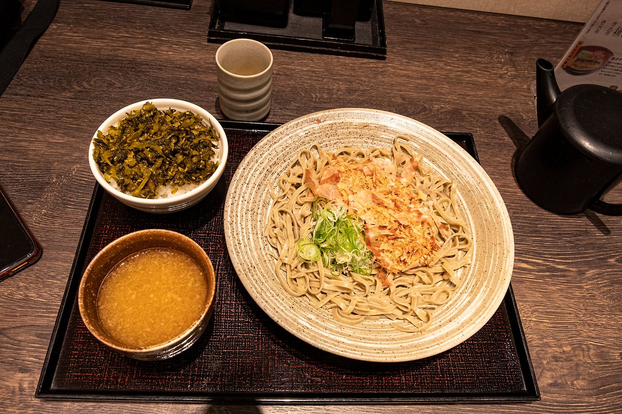 기본 에치젠 오로시 소바(이하 오로시 소바) 하나와 마침 배가 고파서 밥을 하나 주문했다. 흰 밥이 없어서 '갓 무침 밥(高菜ごはん)'을 주문했다. 처음 만나는 오로시 소바는 상식의 틀을 깨는 음식이었다. 면은 넓적하고 그 위에 가쓰오부시 토핑이라니. 장국은 외관상으로는 간장소스가 맞는지 의구심이 들 정도로 흰 빛이었다.