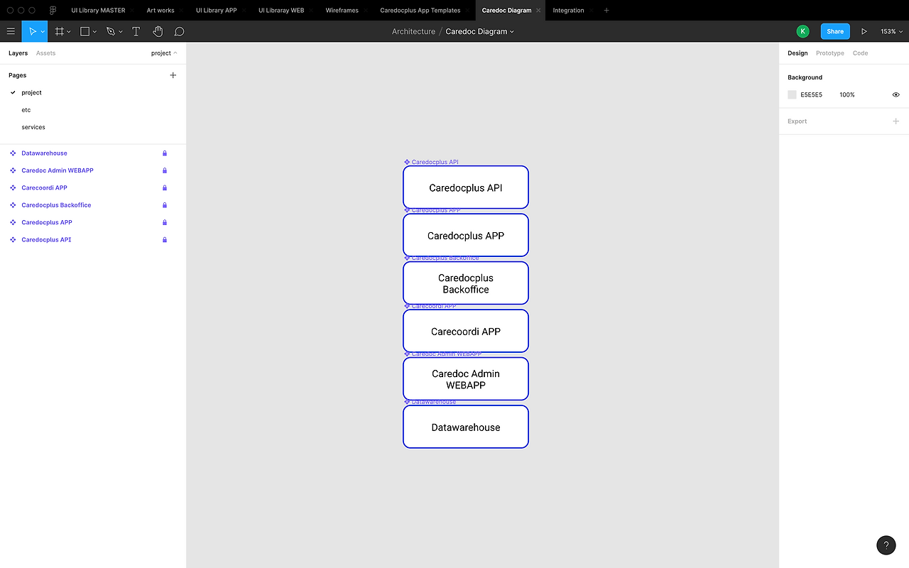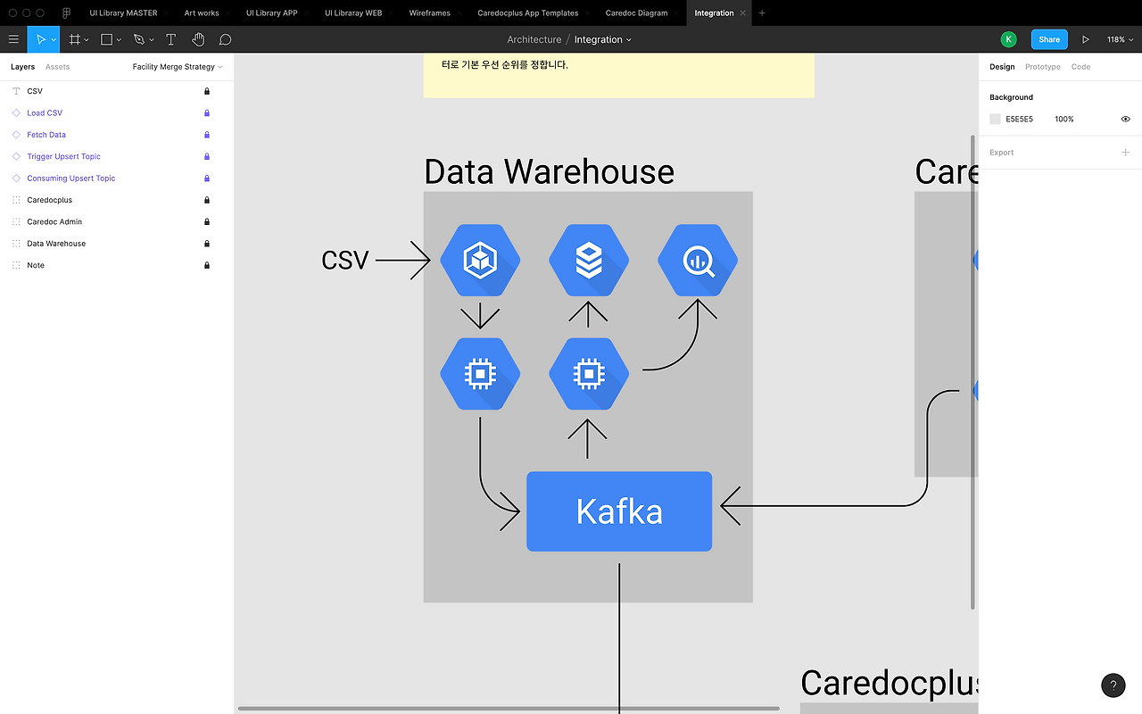 사실 이미 퍼블리싱 영역까지 해결해 버려 기획과 개발 간 단계를 줄이고 라이브러리를 통해 생산성을 향상해 일정을 단축한 이득이 있지만 또 다른 고민을 해결할 수도 있겠다는 생각이 머리를 스쳤습니다. 그것은 바로 아키텍처 설계의 영역이었습니다. draw.io나 miro 같은 각 종 툴들을 써 봤지만 그리기가 너무 힘들고 결정적으로 파편화되어 있어 다이어그램을 그려놔도 어디에 있는지 찾는 것도 일이다 보니 업데이트가 되지 않아 다른 동료가 합류했을 때 쉽게 기존 시스템을 이해하기 힘든 어려움이 있었습니다. 그래서 라이브러리 기능을 활용해 우리만의 시스템만의 라이브러리를 만들어 일관성 있는 다이어그램을 그리면 어떨까 생각을 했습니다.