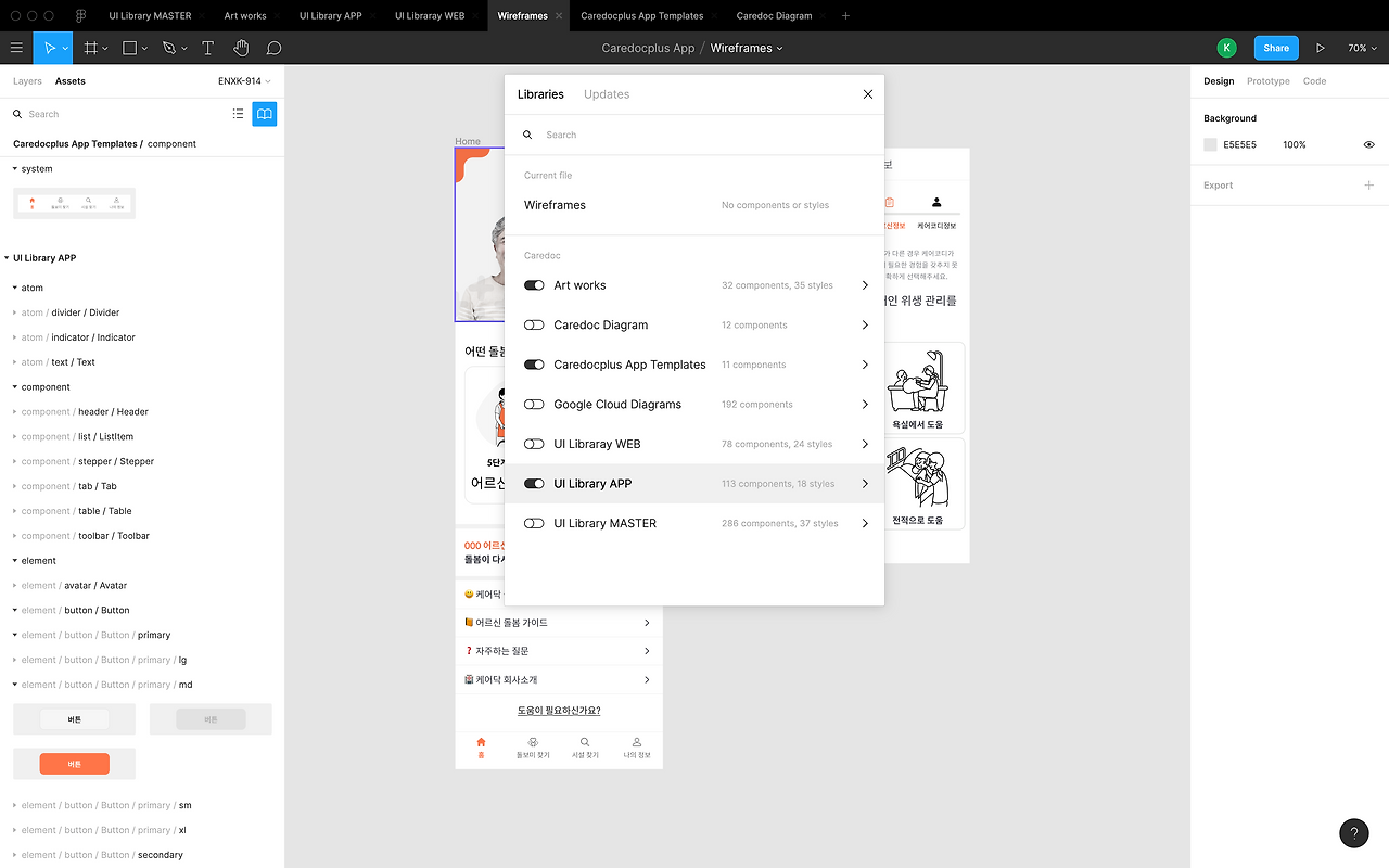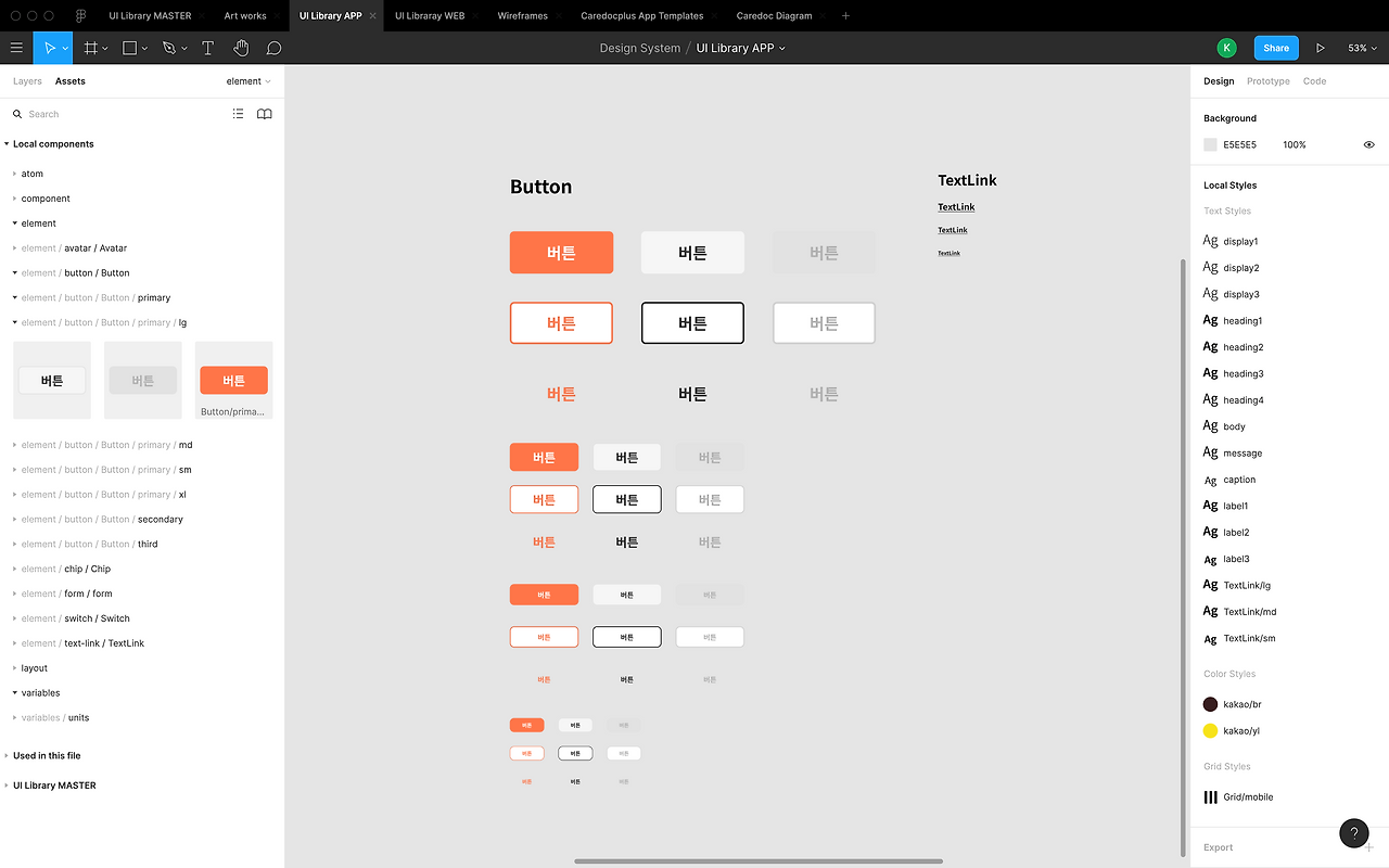 또 한 BI/BX에서 파생된 asset들을 관심사별로 나누어 asset화 시켜 라이브러리화 한다면 구글 드라이브나 각 그래픽 툴에 파편화된 asset들의 관리를 한 곳에서 할 수 있을 뿐 아니라 개발자만이 아닌 마케팅 등 다른 팀에서도 쉽게 작업을 할 수 있을 것 같다는 생각이 들었습니다. 필요한 asset들을 조합해 시안을 만들 수도 있고 asset들을 모아 원하는 component를 만든 다음 export 해 다른 그래픽 툴에서 작업을 하면 일관성 있는 작업을 회사 전체적으로 할 수 있는 것이죠.