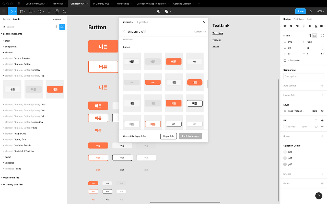 앞 서 언급한 instance와 component를 이용 해 라이브러리를 퍼블리싱할 수 있습니다. 이렇게 만들어진 라이브러리는 팀 단위로 쓸 수 있으며 plugin으로 공유할 수 도 있습니다. 퍼블리싱되면 다른 파일에서 토글만으로 사용할 수 있으며 해당 라이브러리를 업데이트하면 의존성을 가진 모든 파일들이 업데이트됩니다.