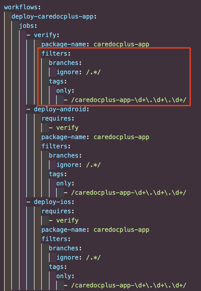 웹과 마찬가지로 트리깅 조건과 package 이름을 어떻게 주입할지 살펴봅니다 트리거 조건을 먼저 살펴보면 Circle CI는 저장소 변경 전체를 감시하고 config.yaml파일을 읽어 branch와 filter라는 조건으로 트리깅을 합니다.