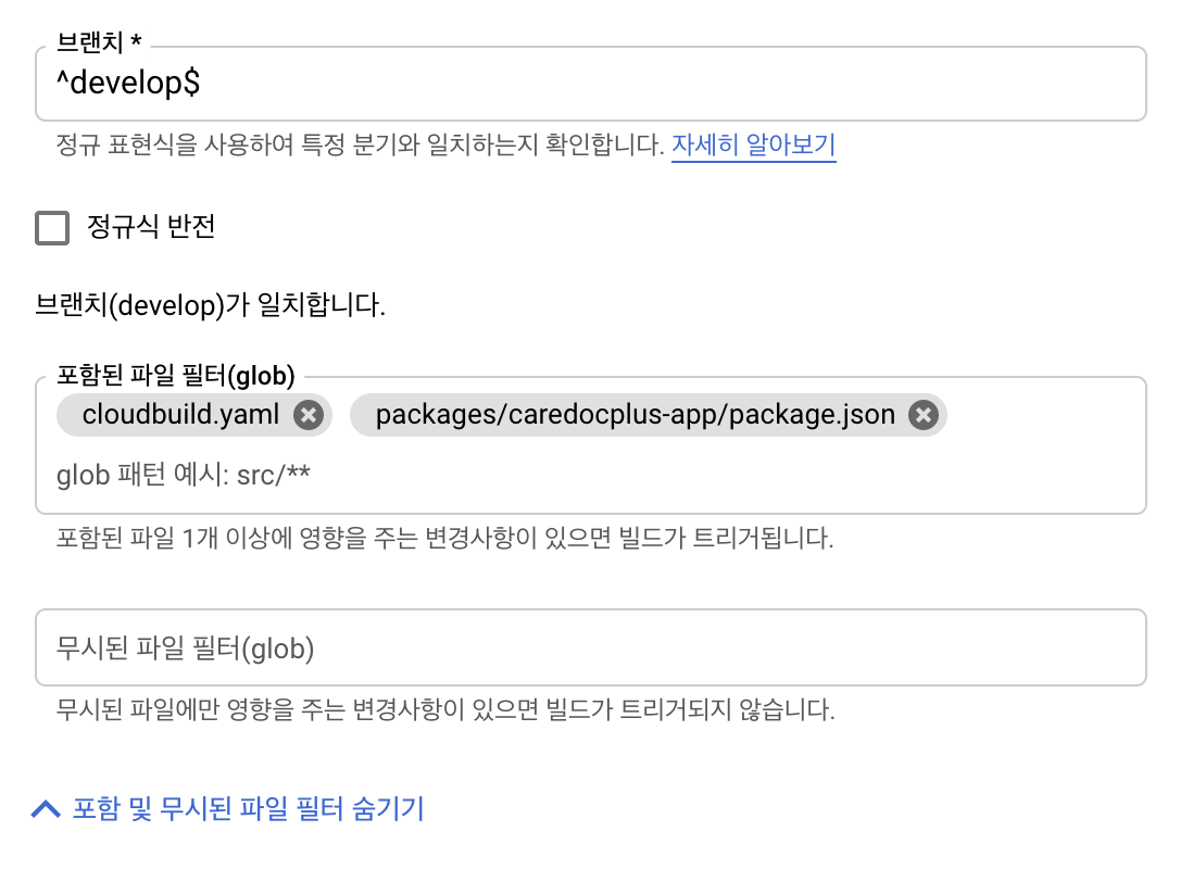 Google Cloud build의 경우 브랜치나 태그 기준(정규식)으로 트리깅이 가능하며 트리거 옵션 중 glob pattern이라는 옵션이 있습니다. 리눅스의 그것과 비슷한 옵션인데, 특정 파일이 변경되었을 때의 조건을 추가해 줍니다. lerna의 publish 자체가 npm version을 기준으로 하기 때문에 package.json의 변경점을 glob pattern으로 추가해 주면 lerna publish나 npm verion, yarn version 등의 명령어로 쉽게 트리거 조건을 만드는 게 가능합니다.