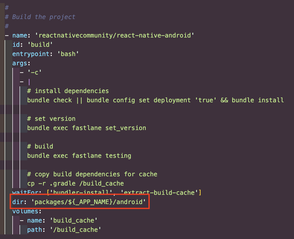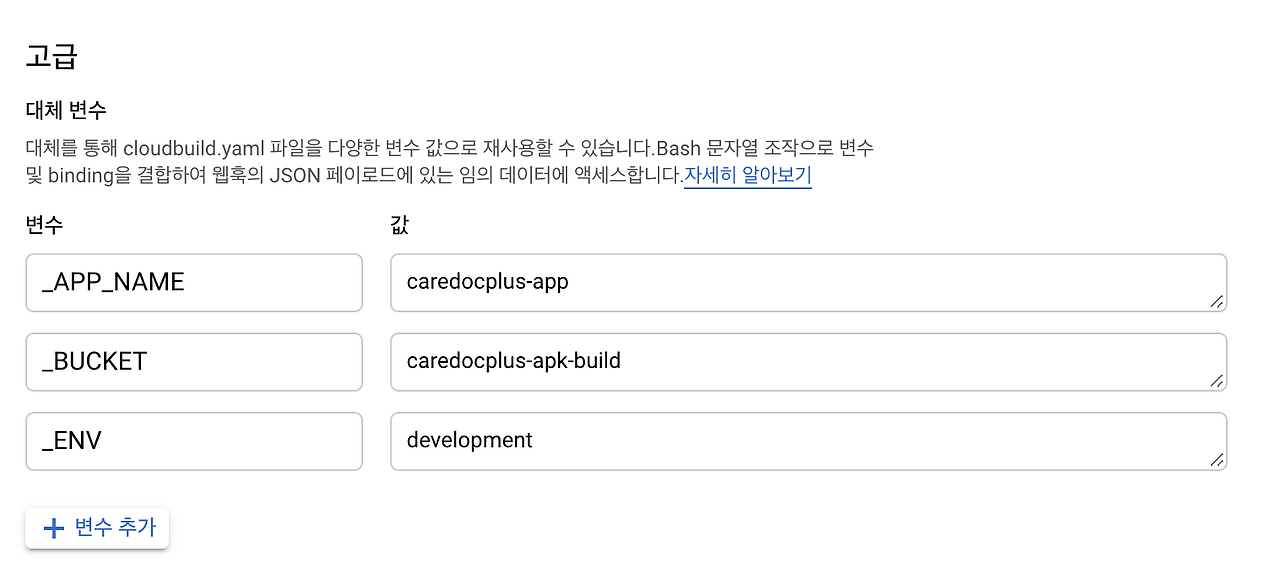 그다음은 package 루트 지정입니다. Cloud build에는 dir이라는 프로퍼티를 지정해 주면 됩니다. 트리거 옵션 중 환경변수를 이용하면 됩니다.