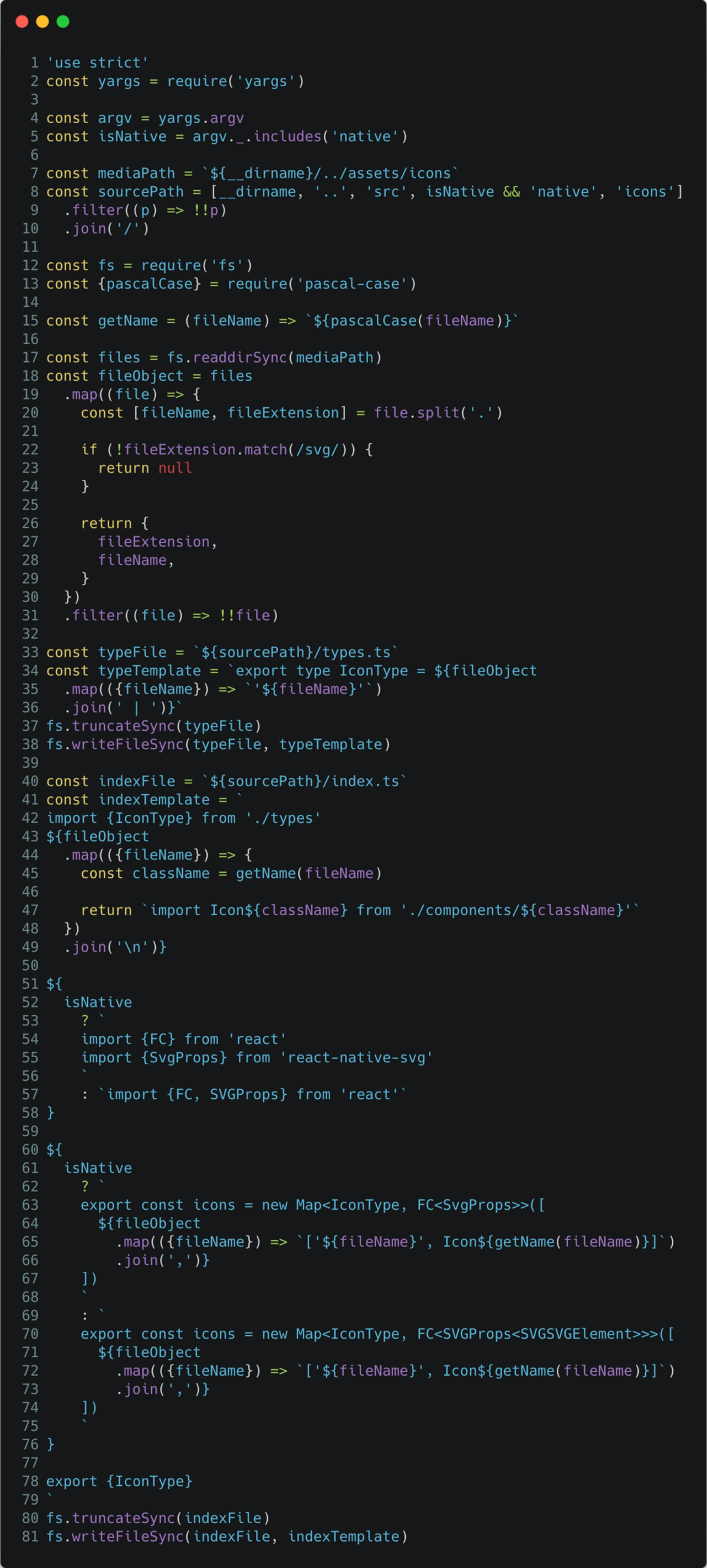 svgr을 이용해 component를 만들어 줬다면 component들을 약속된 name convention에 맞게 불러서 쓸 수 있게 하기 위해 index.ts와 types.ts를 만드는 스크립트입니다.