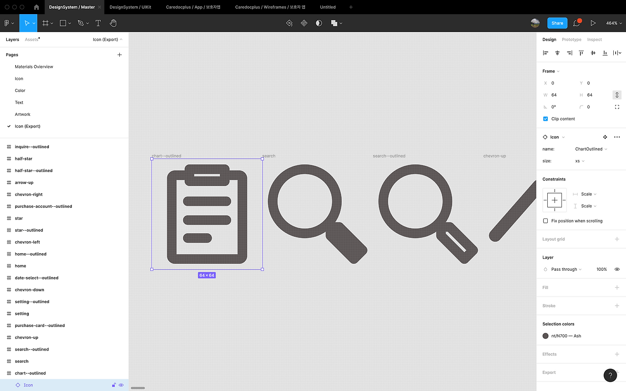 figma에서 Icon을 assets 라이브러리로 사용하기 위해서는 사이즈에 대한 variations이 필요합니다 UI component들의 경우 figma에서 variation 된 대로 코드 구현을 하면 되지만 Icon SVG를 component로 변환을 하게 되면 SVG props를 이용해서 사이즈를 조절해야 하기 때문에 기준 Icon을 vector화 해 constraints를 scale로 설정해 주고 export용 frame Icon을 만들어 줍니다.