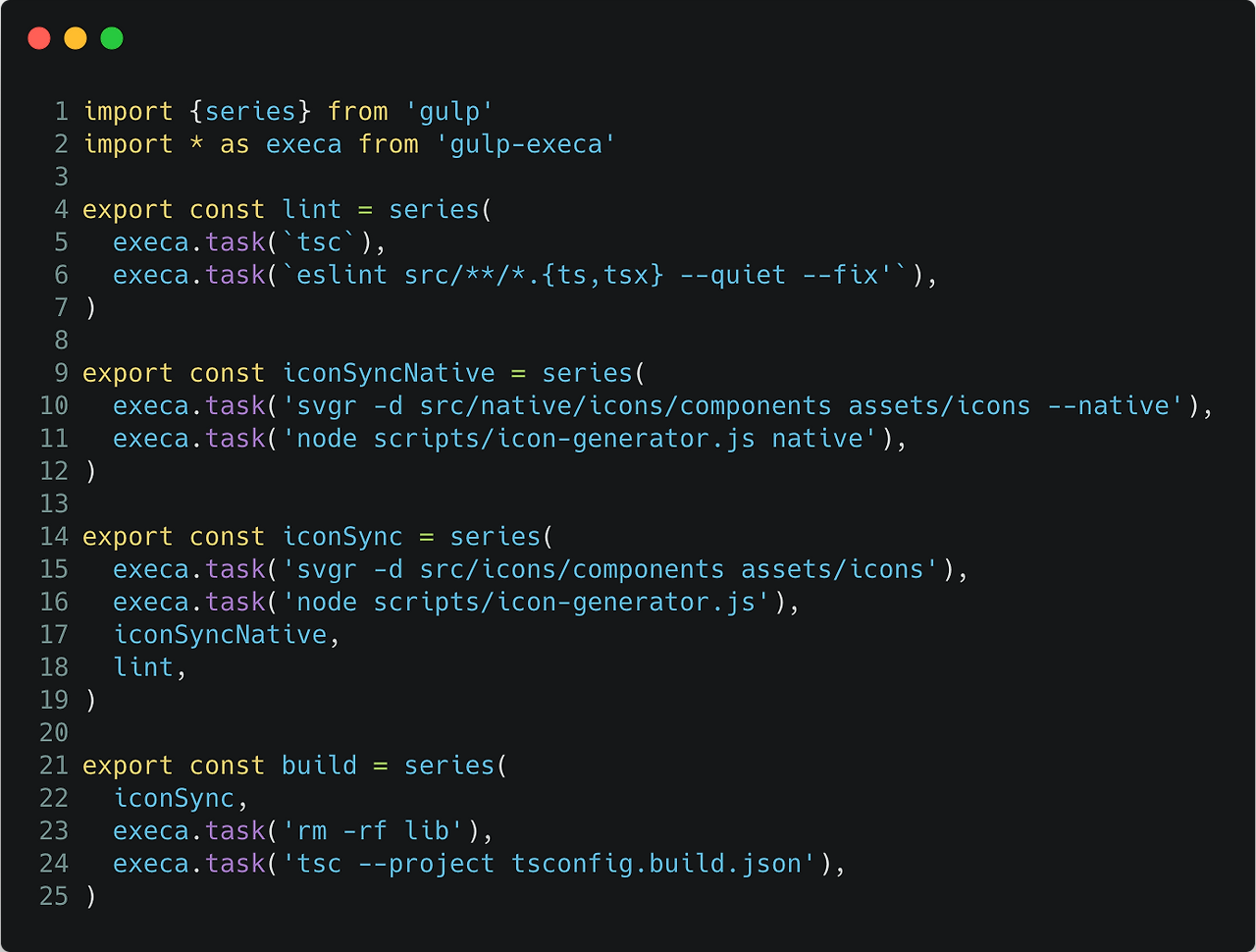 gulp를 이용해 svgr과 스크립트를 조합해 react, react native component를 만들고 빌드할 수 있는 task를 만들어 줍니다 build나 iconSync 스크립트를 이용해 손쉽게 Icon SVG들을 react와 react native component들로 만들 수 있습니다. 끝으로 npm publish를 통해 다른 프로덕트 패키지 UIKit에서 참조할 수 있게 만들어 줍니다.