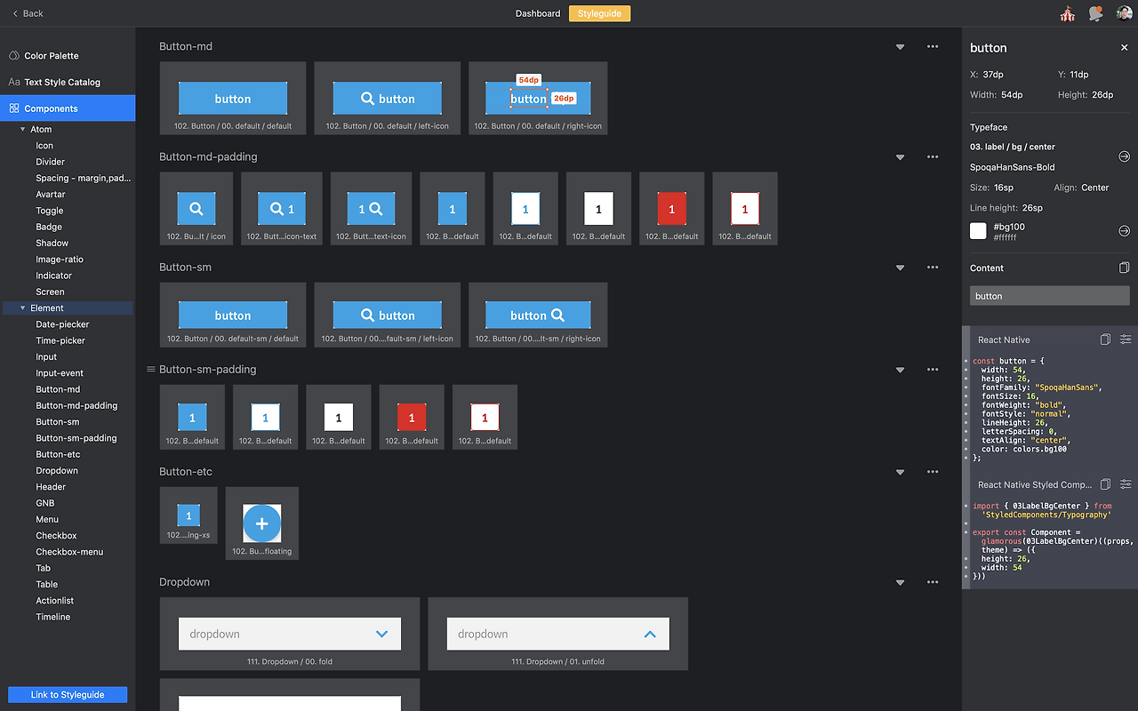 그리고 그 작업 결과물을 zeplin에 있는 스타일 가이드를 이용해 native의 style code로 뽑아냅니다. (extension을 설치해 css나 sass 혹은 안드로이드, iOS같은 native 스타일로도 뽑아낼 수 있습니다) 이렇게 뽑아낸 스타일 코드를 개발자들이 디자인 시스템 native 라이브러리의 해당 요소 컴포넌트에 style code를 적용하는 것이죠.