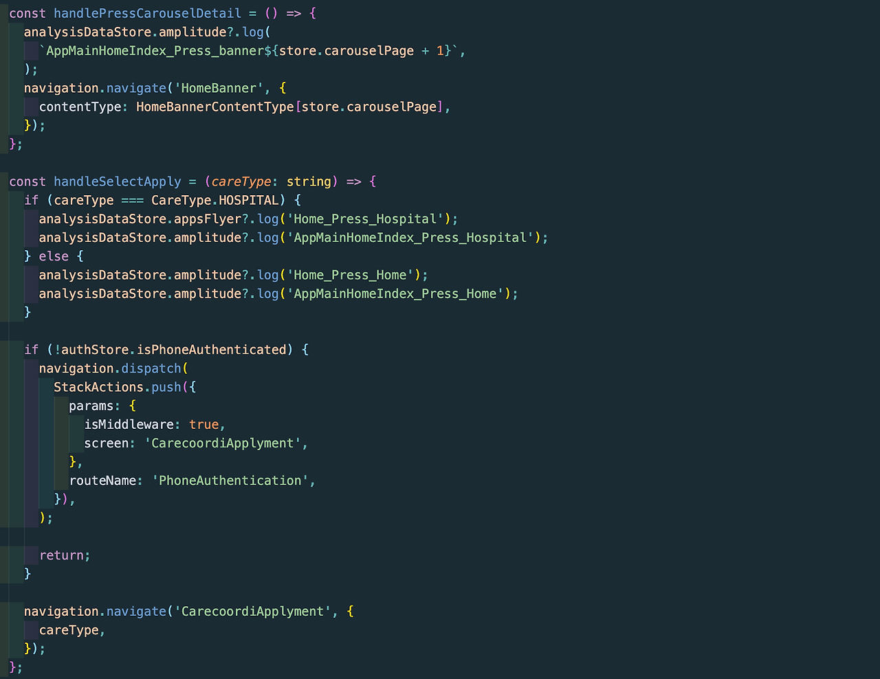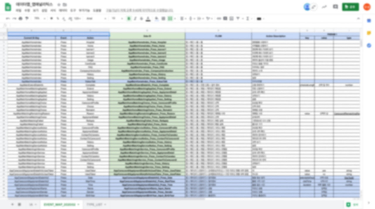 공개할 수는 없지만 내용은 간단합니다. IA(Information Architecture)를 기반으로 화면 전환과 각 스크린(혹은 페이지)에서 발생할 수 있는 행동 구분(터치, 클릭 등)에 따라 key를 생성해 관리하는 것이 다입니다. IA를 기준으로 멋지게 이러한 표를 export 해주는 툴이 찾아봤지만 찾지 못했죠... 아마 가장 허들이 되는 일일 듯합니다. 사실 이 문서를 만드냐 마냐에 따라 그로스해킹을 하냐 마냐가 결정된다고 봐도 과언이 아닐 듯합니다. 하지만 케어닥은 다릅니다 CTO가 발 벗고 나서서 만들어버립니다. (물론 정답은 아니겠...)