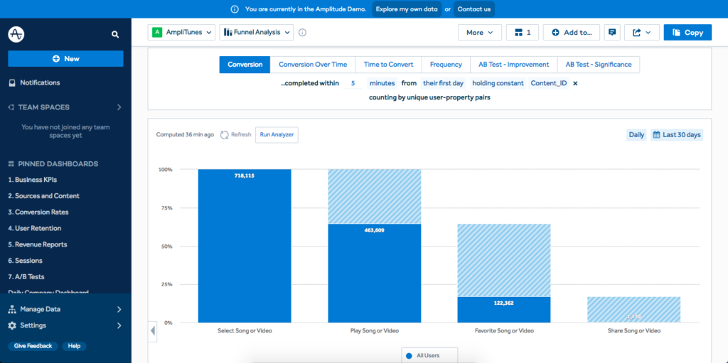민감한 정보이기 때문에 구글에 오픈되어 있는 사이트에 나와 있는 예제를 자료사진으로 썼습니다.(출처: https://insightwhale.com/amplitude-vs-mixpanel-in-mobile-app-analytics-comparing-the-tools/) 사진의 경우 71만명이 들어와 1700명 가량 funnel을 통과 했네요 1700명이나 통과하다니... 어찌됐던 이렇게 데이터 맵에 따라 심은 이벤트 키로 funnel을 대시보드로 구성해보면 funnel 통과 중 이탈률과 최종 목표까지 도달한 통계를 볼 수 있습니다. 크게는 스크린(페이지) 단위로 먼저 인사이트를 얻고 가장 큰 부분을 세분화 해 인사이트를 얻어 분석을 합니다. 이에 따른 분석 결과를 가지고 다시 1단계로 돌아가 다시 가설을 세우는 과정을 반복하는 것이죠! 신나지 않습니까? 반복이라니!! 야호!!!!