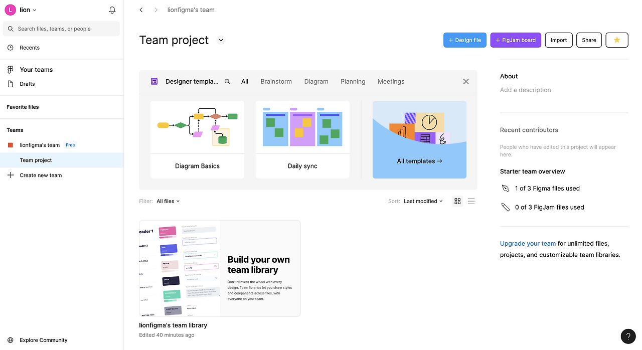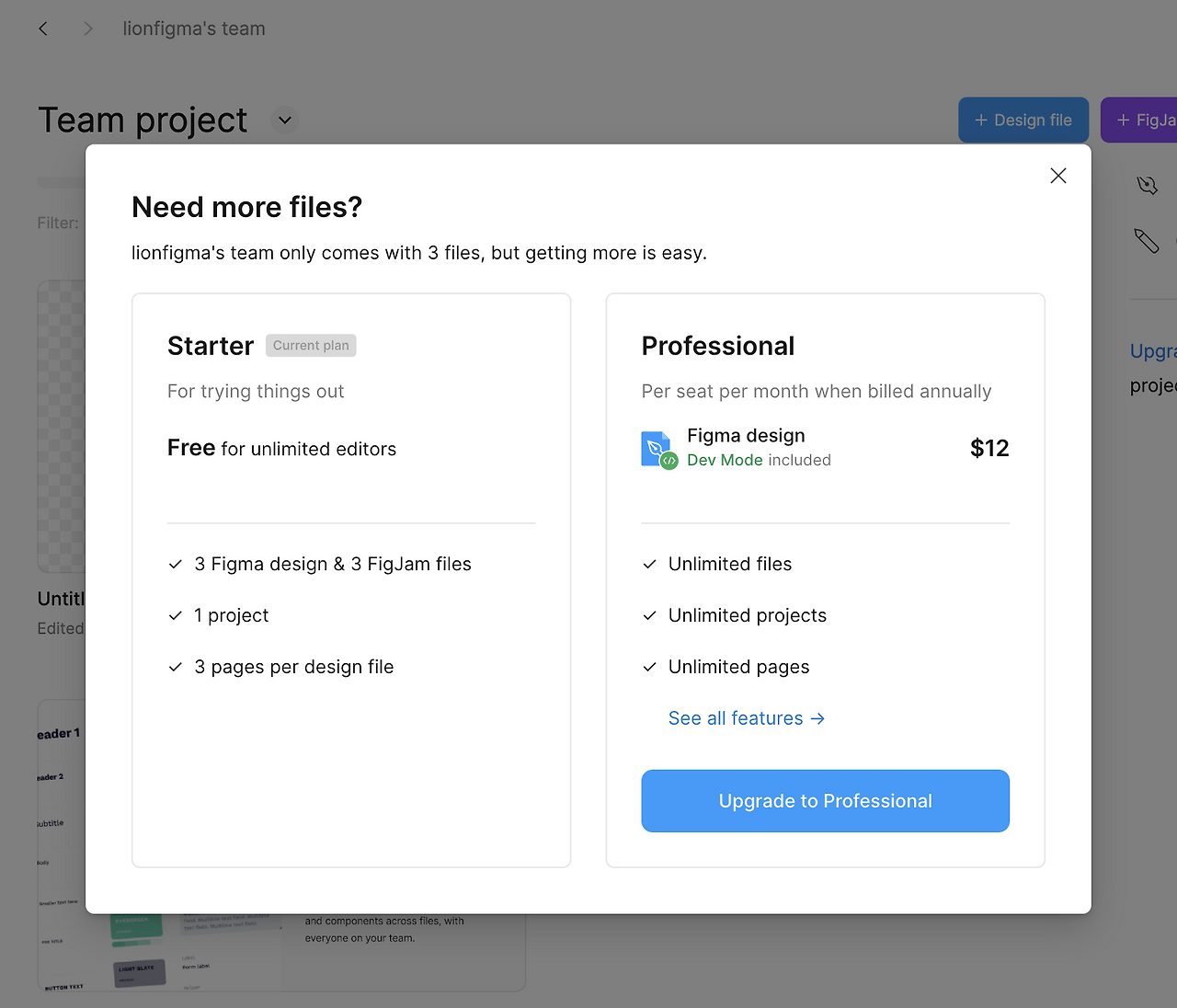 팀 프로젝트를 눌러보면 오른쪽에 나와있는 설명과 같이 3개의 디자인파일과 3개의 피그잼을 만들 수 있고, 3개가 초과하게 되면 팝업이 나와서 프로페셔널 요금제를 안내해주고 있어요.