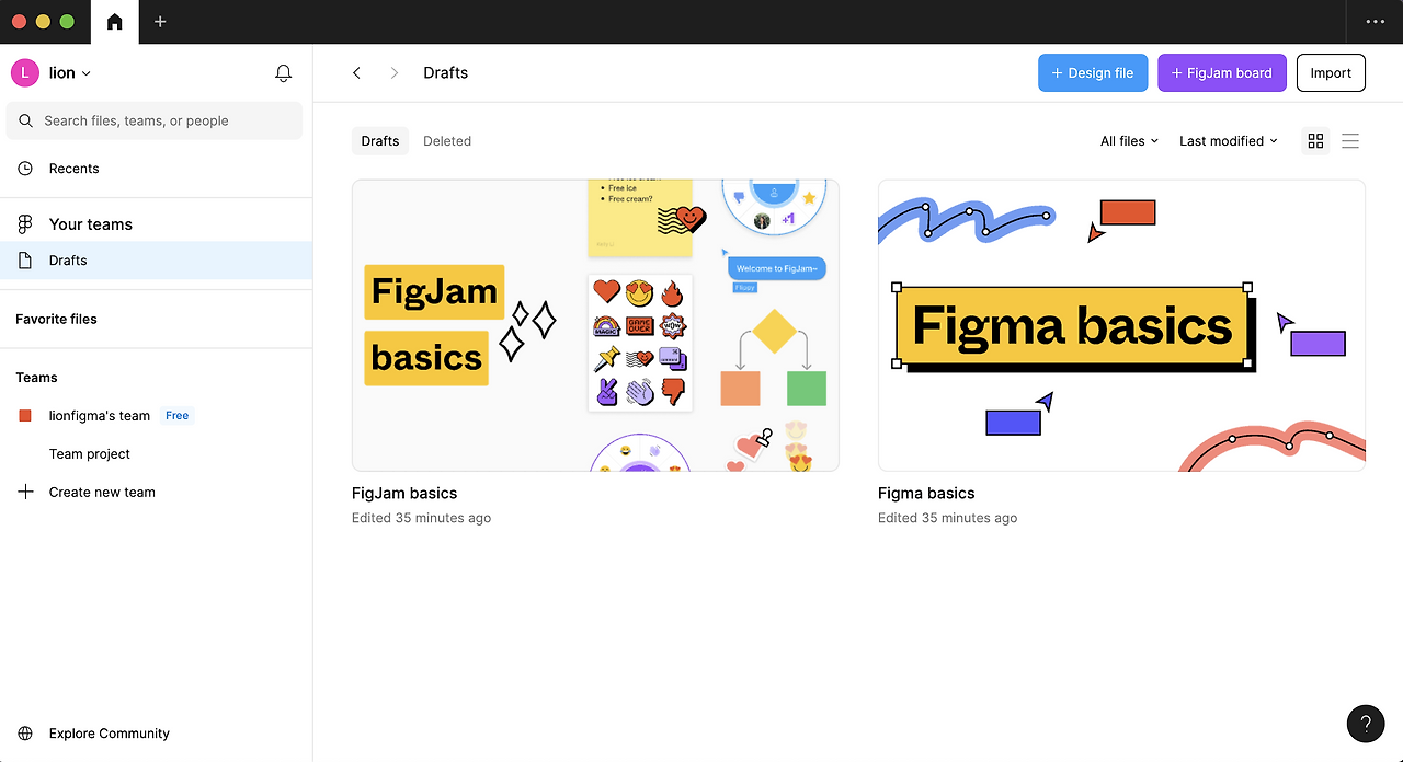 드래프트는 임시 작업 파일(초안) 영역이에요. 개인적으로 작업할 때는 여기서 디자인파일을 생성해서 사용하시면 돼요. 하지만 공통으로 여러 명이 접속해 제작에 참여해야 한다면 팀 프로젝트에서 파일을 생성하거나 드래프트에 있는 파일을 팀 프로젝트로 이동해야 사용할 수 있어요.