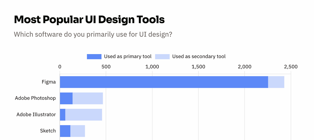 2023년 UXtools*에서 디자인툴 서베이 결과에 따르면, 전 세계적으로 UI tool은 피그마를 가장 많이 사용하고 있는 것을 볼 수 있어요.