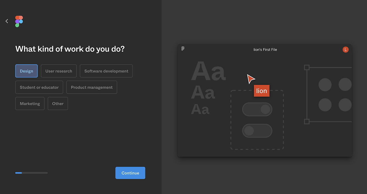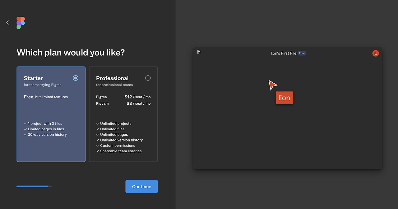 3. 다시 피그마 웹화면으로 돌아와서 몇 가지의 질문에 대답 후 Continue 클릭 xN회
