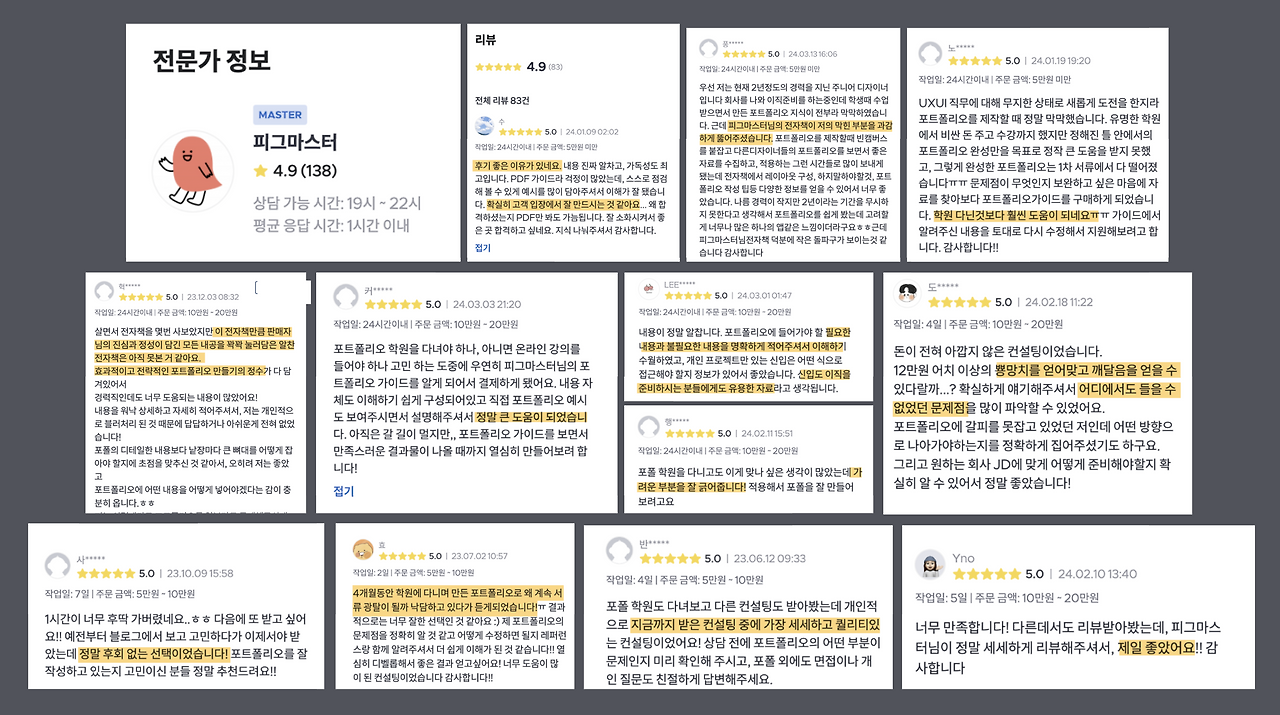 UX UI 포트폴리오 판매자로서는 유일하게 크몽 최고 등급 Master를 달성하였고, 만족도 99% 구매자 후기 140개 이상이 있습니다.