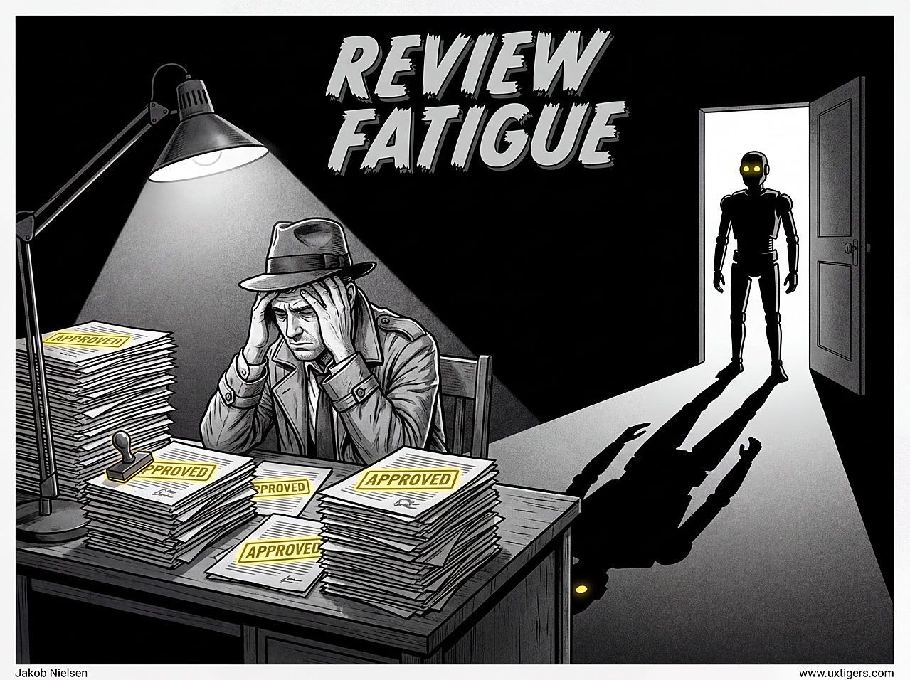 이때 사람의 역할은 생성이 아니라 검토가 되어, 50단계 체인을 어떻게 한눈에 검증할지라는 감독 인터페이스가 UX의 핵심 과제가 되고, 과도한 검토 요청으로 인한 리뷰 피로(Review Fatigue)도 문제로 떠오른다고 경고합니다. 앞으로의 UX 과제는 프롬프트 UI가 아니라, 에이전트의 50단계 추론 과정을 한눈에 검증할 수 있는 ‘감사(Audit) 인터페이스’를 설계하는 것이라고 정의합니다.