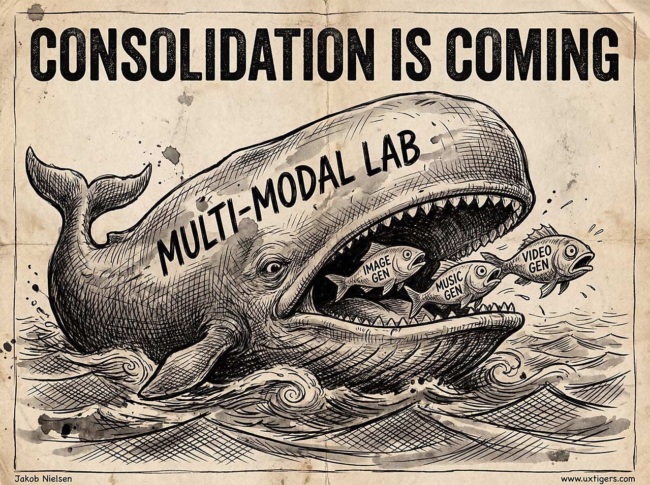 음악의 경우 아직 대형 랩이 전면에 나서지 않았지만, Suno 같은 단일 모달 강자의 독립 시기도 2026년 이후에는 위태로울 수 있습니다.