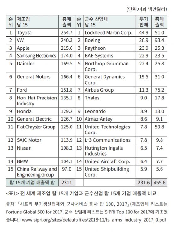반면 록히드마틴이 기록한 최대 매출은 2017년 510억 달러입니다. 이렇게 말하면 너무 커서 감이 안 옵니다. 2017년 애플의 매출액이 2150억 달러이고, 삼성전자의 매출액이 1740억 달러입니다. 애플과 삼성에 비교하면 적은 돈이라고 생각할 수도 있습니다. 하지만 애플과 삼성이 어떤 회사들입니까. 전 세계인들이 하나씩 들고 다니는 스마트폰 시장의 가장 큰손인데다가 스마트폰만 만드는 회사가 아닙니다. 에어팟, 맥북, 아이패드, 삼성전자의 생활가전 제품들까지 다 합친 매출입니다. 우리의 일상 생활에서 애플과 삼성전자의 제품을 다 없애버린다고 상상해보세요. 절반이 넘는 사람들이 핸드폰이 사라지고 어떤 사람들 집에서는 컴퓨터, 냉장고, 세탁기, 텔레비전도 없어지겠죠. 반면 록히드마틴은 보통의 사람들이라면 일상생활에서 접할 일이 없고 사라진다고 해도 크게 상관없을 무기를 파는 회사입니다. 그럼에도 불구하고 삼성전자와 애플에 견줄 수 있는 매출을 올리고 있는 것이죠.