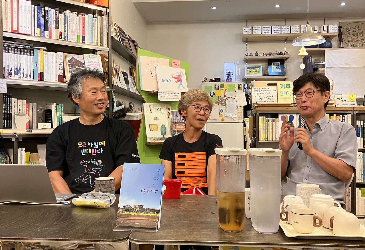 그러고는 한 달이 지났는데 최근에 나온 <사람을 잇다 사람이 있다 삼달다방> 책 북토크를 파주 교하에 있는 쩜오책방에서 한다는 게 아닌가. 제주에서 내가 받은 환대가 생각났고, 북토크에 신청해 오케이와 무심을 보러 다녀왔다. 쩜오책방이 가득 찼는데, 대부분이 삼달다방에 다녀온 분들이었다. 활동가들이 삼달다방을 좋아하는 건 익히 알고 있었고, 왜 그런지도 쉽게 짐작이 간다. 믿고 의지하는 좋은 선배 활동가가 있는 곳이고 누구도 차별하거나 배제하지 않는 곳이니까. 인권활동가들에게는 힘들면 쉬러 갈 수 있는, 언제나 든든한 뒷배처럼 느껴지는 곳이다. 그런데 쩜오책방 북토크에 온 분들은 직업활동가들이 아닌데, 오케이나 무심을 원래 알던 사람들이 아닌 분도 많은데 삼달다방에 다녀온 뒤 그곳을 너무나 사랑하게 된 분들이었다. 무엇이 이 사람들의 마음을 앗아갔을까, 북토크와 뒤풀이 내내 생각했다.