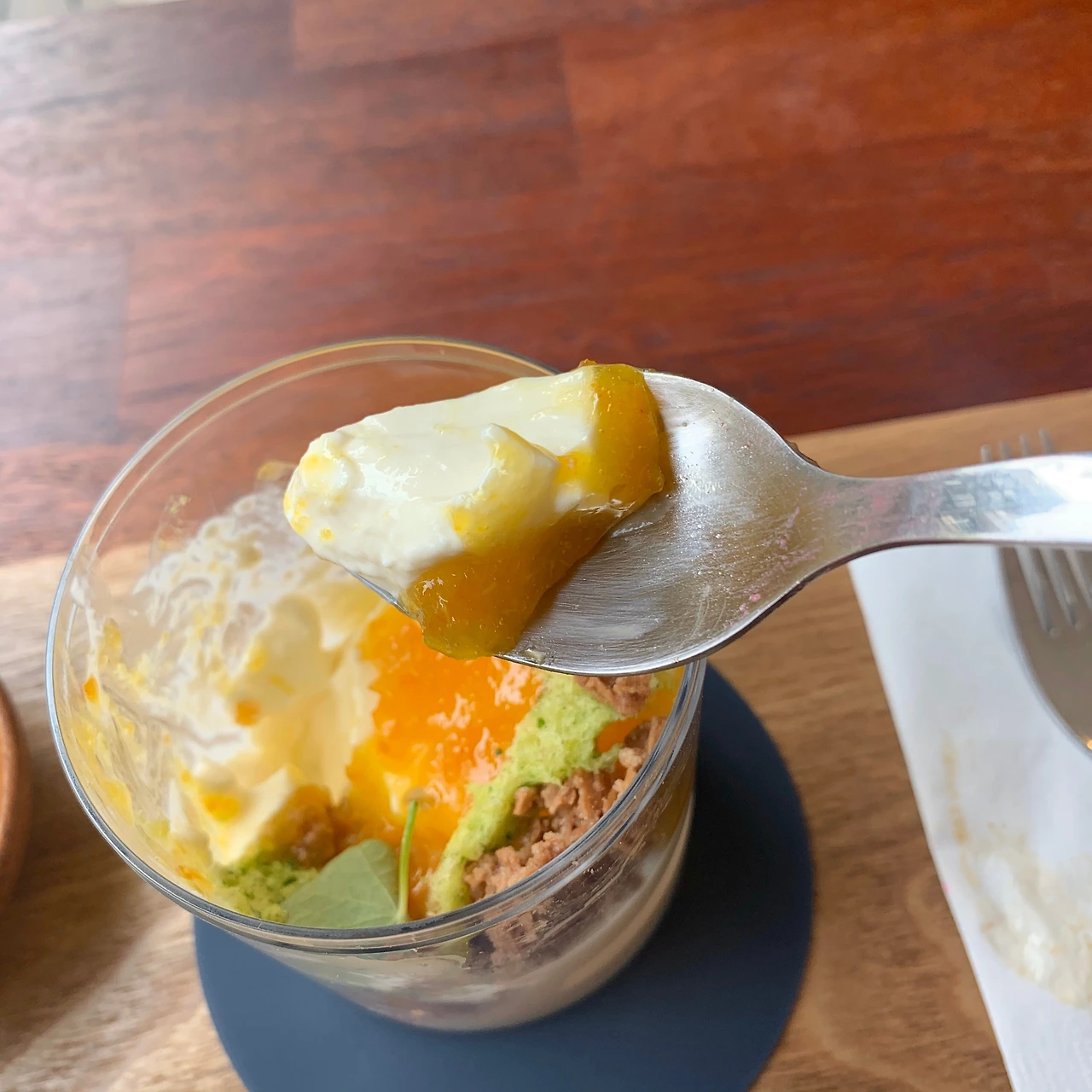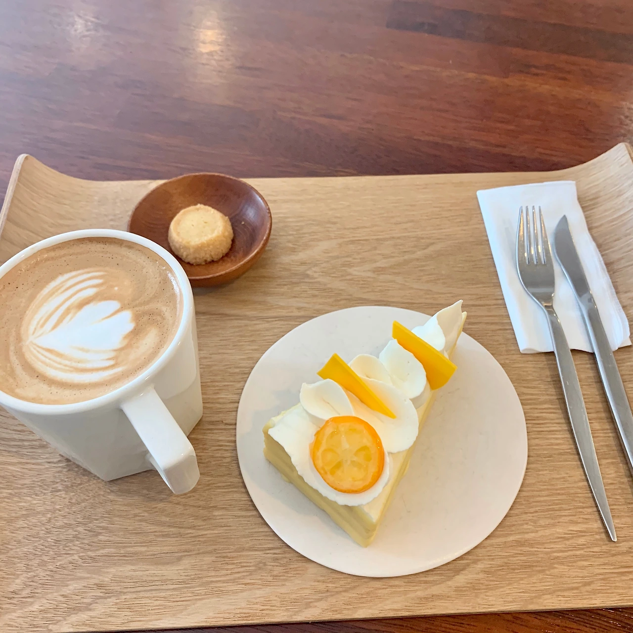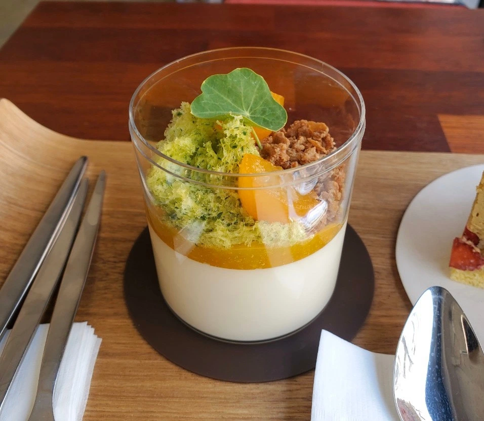 위에 금귤, 판나코타와 같은 형식의 재료 조합으로 케이크가 만들어졌다. 케이크 겉 표면에는 화이트 초콜릿인지 둘러져있어 초콜릿 식감이 느껴져서 푸딩의 향과 케이크를 동시에 맛보는 신기한 경험이었다. 하나의 케이크에서 달달함과 깔끔함이 느껴져서 좋았다.