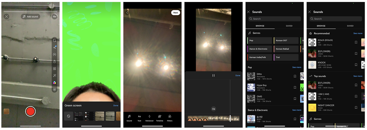 나는 휴먼다큐멘터리 조연출로 근무한 경험이 있고, 20분 길이의 다큐멘터리 3부작을 제작한 경험이 있다. 롱폼 편집 경험이 있다는 말인데, 그래서인지 틱톡과 인스타그램 릴스와는 다른 쇼츠의 UX를 발견할 수 있었다. 편집의 흐름이 마치 롱폼 편집의 흐름과 유사하다는 것이다. 앞선 틱톡과 릴스는 편집 방식이나 음악을 미리 결정하고 그에 맞는 영상을 촬영하거나 선택하는 순으로 제작된다. 기존 롱폼의 경우 일단 촬영을 마친 후 컷을 잘라 붙여 영상 최종본을 만들고, 이후에 자막이나 음악을 입힌다. 유튜브 쇼츠는 위의 첫 번째 이미지에서 볼 수 있듯 최초 영상 촬영 순간에 모든 기능을 지원하고는 있지만, 뒷부분에서 롱폼 제작처럼 촬영된 영상에 다시 효과를 선택하여 최종 편집할 수 있도록 UX를 제공하고 있다. 롱폼 제작에 익숙한 유저들을 고려한 UX가 아닐까 싶다. 쇼츠는 틱톡이나 릴스처럼 음악이 영상의 아이덴티티를 결정하지는 않는다. 틱톡과 릴스가 챌린지나 영상 테마에 따라 음악을 추천하는 것과 달리, 쇼츠는 배경음악 그 자체로서 장르별로 먼저 제공하고 있다.