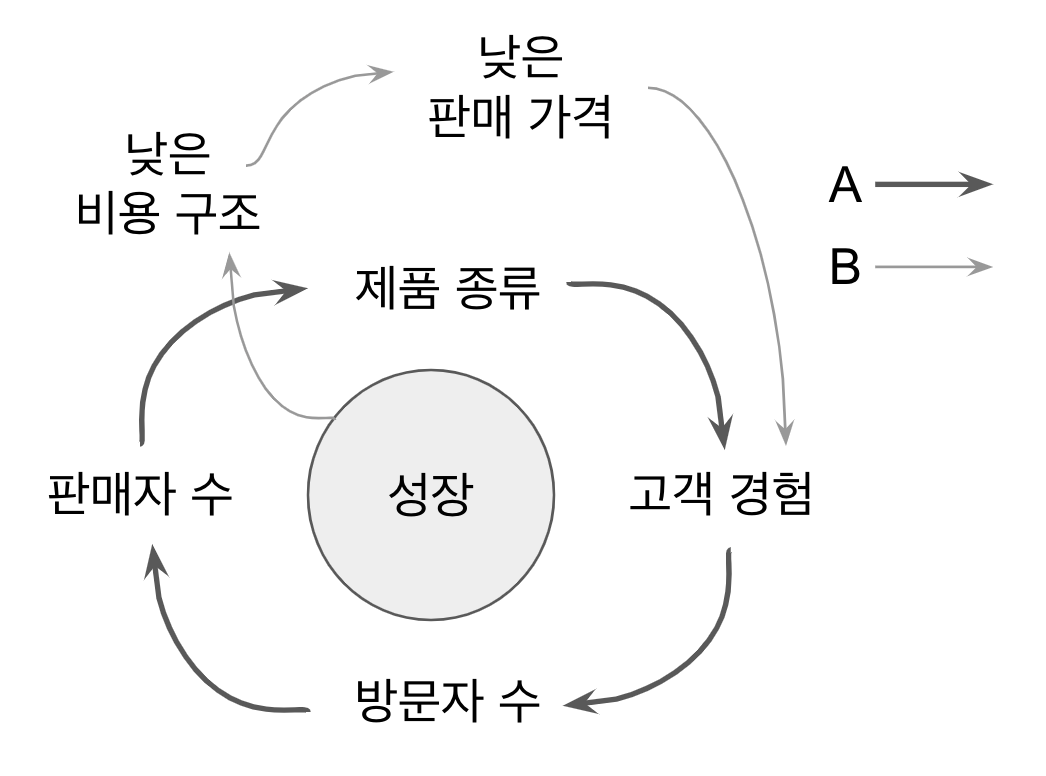 연한 색의 B 바퀴는 성장Growth → 낮은 비용 구조Lower Cost Structure → 낮은 판매 가격Lower Prices → 고객 경험Customer Experience 으로 이루어진, 성장을 통해 더 큰 성장을 견인하는 두 번째 바퀴다.