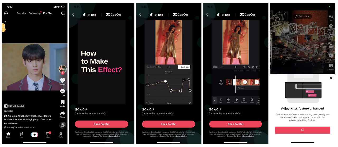 원하는 효과를 편리하게 넣을 수 있는 편집 툴을 제공하고 있다. 2022년 10월경을 기준으로, 해당 기능을 통해 어떤 효과를 볼 수 있는지 보여주며 적극적으로 광고하고 있었다. 'How to Make This Effect?'. 내가 지금 보는 영상처럼 만들고 싶지만 이걸 3) 빨리 쉽게 만들고 싶은 유저들의 질문을 역으로 던지며, 사용을 제안하고 있다.