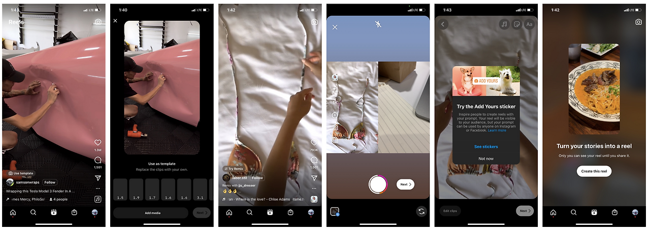 틱톡의 필터처럼 인스타그램 릴스에서는 템플릿이라는 표현으로 유사한 기능을 제공하고 있다. 앞선 글에서 말했듯, 인스타그램은 재미 위주보다는 일상이 주제이다 보니 여행이나 음식, 동물 등의 컨텐츠가 많다. 위 이미지 좌측 두 개는 음악의 박자에 맞춰 화면이 전환될 수 있도록 영상 길이를 미리 분할해 놓은 템플릿에 맞추어 제작할 수 있는 예시이다. 가운데 두 개는 기존의 영상과 내 영상을 함께 보여줄 수 있는 템플릿이다. 마지막 이미지는, 릴스를 보던 중 스토리로 릴스를 만들어보라고 제안하고 있는 모습이다. 아무래도 일상적인 순간을 올린 스토리일 테니, 앞서봤던 음악의 박자에 맞춰 화면이 전환될 수 있는 템플릿을 쉽게 선택하게 될 것이다.